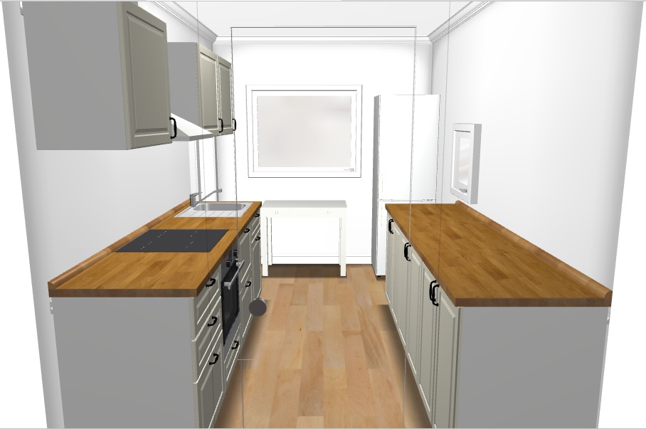 Aus eigener Erfahrung: Dicke des Türblatts vorher genau ausmessen. Bei unserer vorherigen Küche (auch zweizeiler mit Tür an der schmalen Wand und Auszugsschränke an der linken Wand) konnte man die Schublade im ersten Schrank bei geschlossener Tür nur bis zur Hälfte aufmachen, weil die Schubladenfront an dem Rahmen des Glaseinsatzes der Tür gestoßen ist. Eine um 0,5 cm breitere Blende links hätte gereicht, und dieses "Tür auf">"Schublade auf"-Ballett hat mich in den Wahnsinn getrieben. Auch die Zeile rechts braucht eine Blende zur Wand, ansonsten gehen die Drehtüren nicht komplett auf, beim rechten Türanschlag.