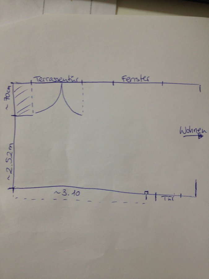 Die Festerfront habe ich außen vor gelassen, da sich die Küche nur an der anderen Seite befinden soll und dort eben der Durchgang am "Tresen" vorbei geplant ist. Zwischen Wand und Terrassentür liegen etwa 60 cm, der Platz dahinter soll zunächst leer bleiben. Die Brüstungshöhe des Fensters liegt bei etwa 80cm. Wir bekommen am Dienstag oder Mittwoch die Schlüssel, sodass ich dann noch genauere Maße nachreichen kann.