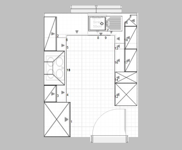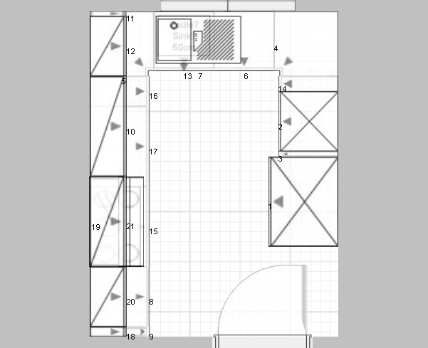 Fugenmaß zwischen Fronten .25 cm, auch oben zw. Front und Arbeitsplatte (Schrank- und Frontenübersicht)