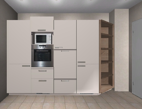 In der Hochschrankwand Vorratsschrank mit Innenauszügen, Backofenschrank, hochgebaute GSP, Kühlschrank und Holzregal ;-)