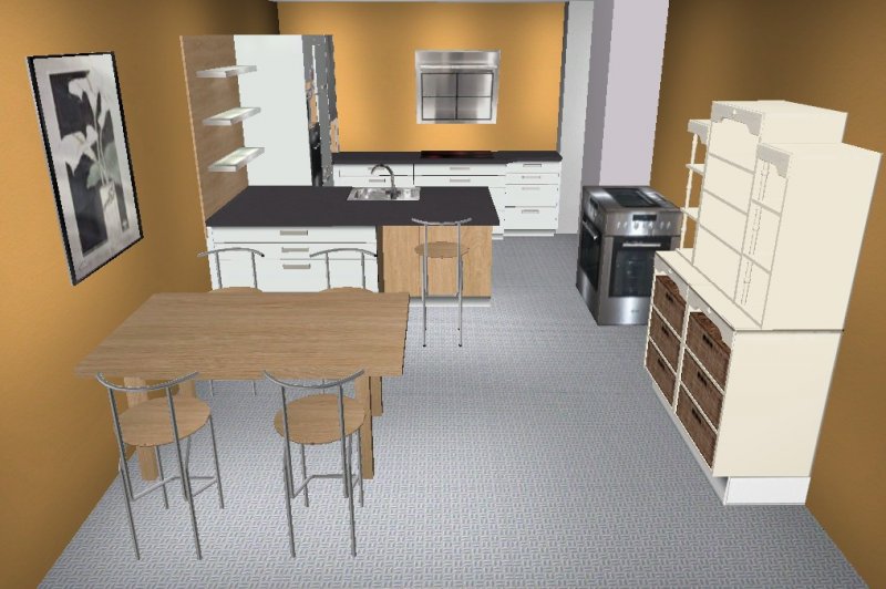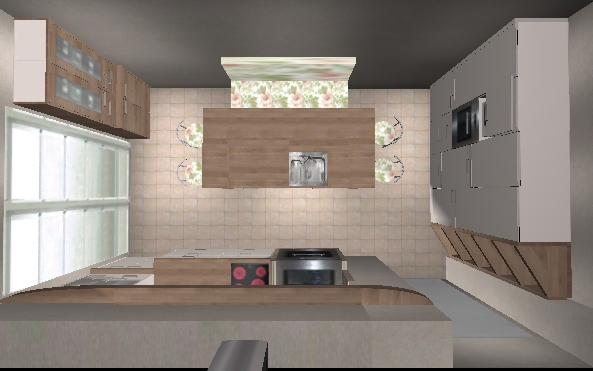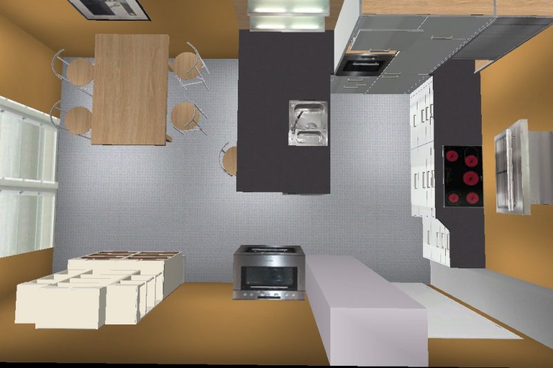 Die Küche wieder als U, aber mit Kochen an der Wand rechts und den Seitenschränken planoben.