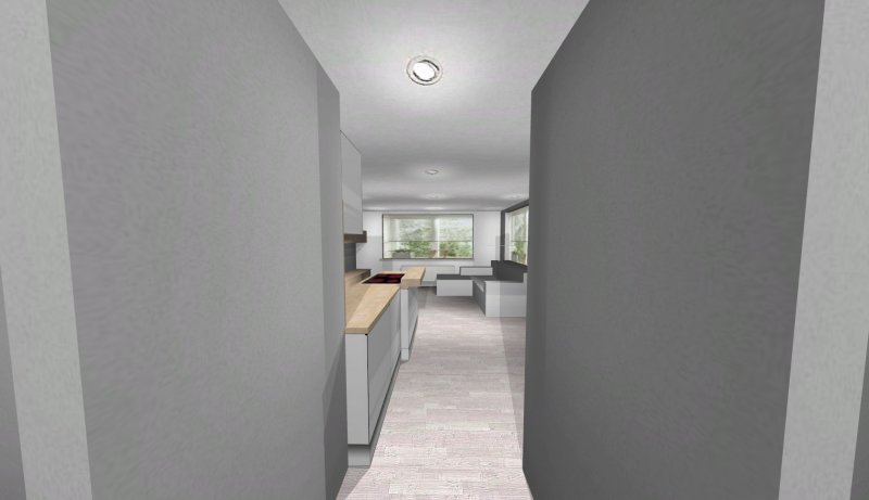 Das vorspringende Eck, dürfte in echt nicht so schlimm sein wenn die Tür offen ist bzw. bin ich am überlegen ob ich die Wand in diesem Bereich verblende.