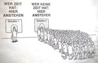 Erinnert mich ein wenig an die Schnellkasse bei uns im Supermarkt.Da stehen auch immer so viele Leute an. Steht überall "Bitte nicht mehr als 7 Teile" Aber wenn ich sehe was da manche Leute alles aufs Band legen.