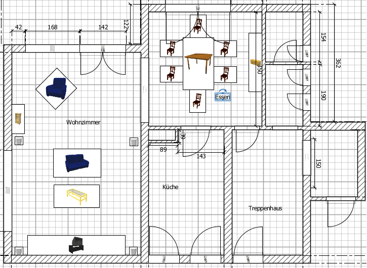 - Die Tür ist momentan auf der "rechten" Seite oben in der Wand, wir wollen aber einen direkten Zugang zum Esszimmer, so das wir die verlegen werden... Abstand und Breite der Tür sind aber (noch) wählbar