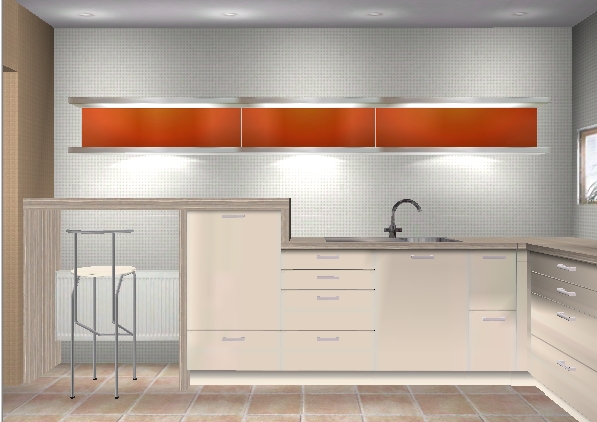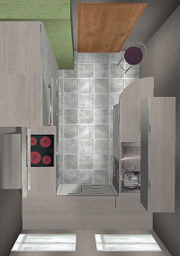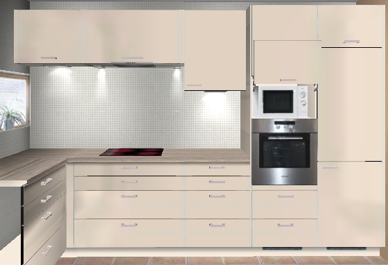 - Die Ecke hab ich nicht tot gewählt, sondern einen Eckschrank mit Böden genommen, da doch etwas Platz gebraucht wird. Durch die geringe Breite der Küche und die Fenster an der Kopfseite habe ich zunächst Hängeschränke weggelassen.