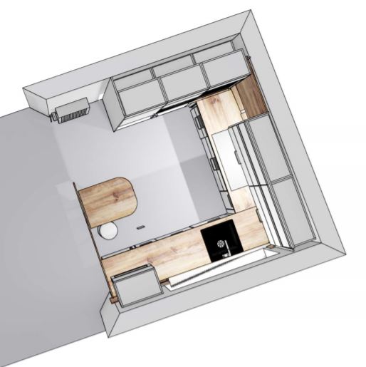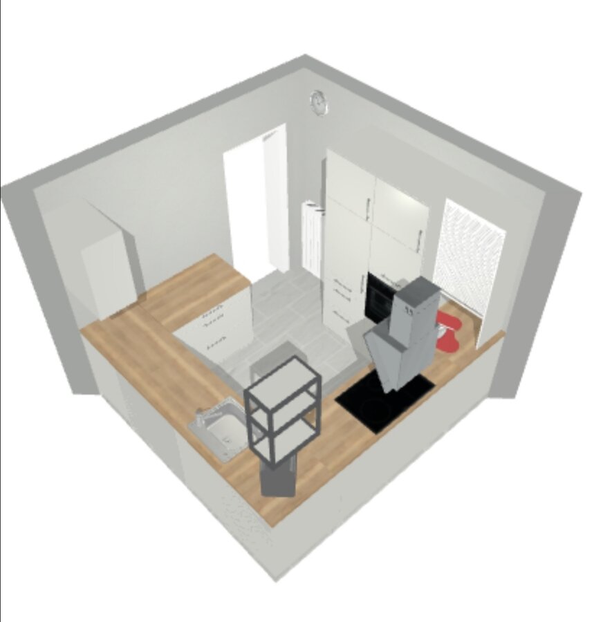 Die Draufsicht beinhaltet den aktuellen Plan mit dem vorhandenen Tisch, der für uns auch funktioniert, bei den anderen Ansichten ist noch eine Theke eingeplant, die wir so nicht wollen - bitte ignorieren.