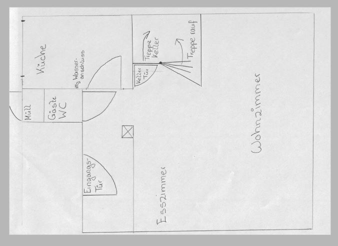 Leider habe ich kein kompletten Grundriss, deswegen habe ich wie es in der Anleitung steht, eine unbemasste Handskizze vom EG gemacht und nur den Küchengrundriss bemaßt. Ich dachte es geht auch bei dem komplette Grundriss nur um evtl. Laufwege usw.