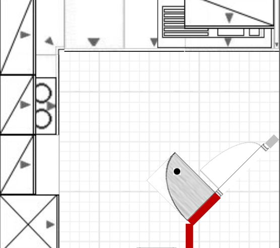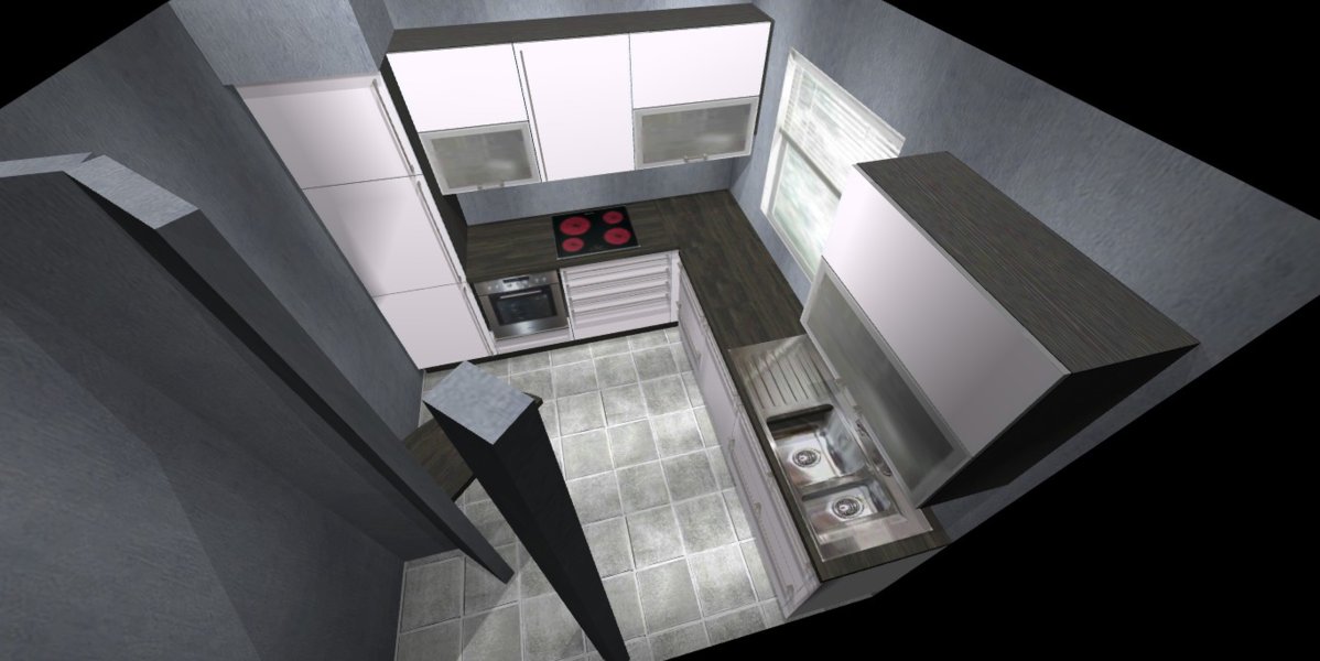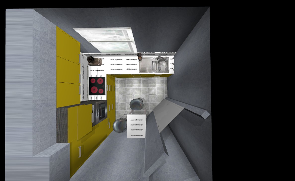 Ich habe einmal meinen Vorschlag aus #5 visualisiert. Überzeugt bin ich davon nicht. Der Stuhl stellt den Zugang zum Kühlschrank zu und durch den hochgebauten BO hast du planlinks nur ca. 15 cm Platz, wenn das Kochfeld etwas versetzt eingebaut wird.