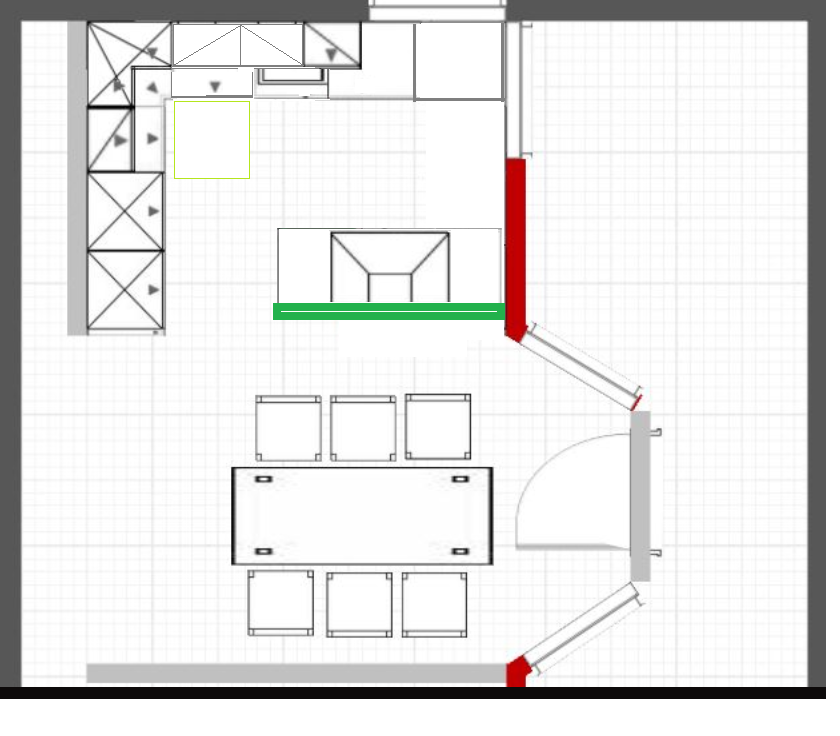 Den Wunsch nach einer Halbinsel könntet ihr mit Hilfe einer 110cm hohen Trennmauer (grün) verwirklichen (siehe Beispielbild). Die sind zwar hier öfters mal verpönt, aber in schmalen Räumen finde ich sie durchaus passend, grade wenn das Kochfeld auf der Halbinsel ist. Hier Halbinsel aus 2x 80cm US, Kochfeld mittig drüber; Alternativ 40 - 80 - 40, ist aber stauraummäßig ungünstiger.