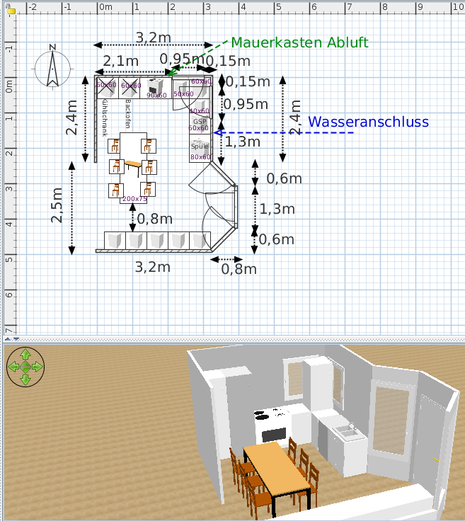 Nochmal ein neuer Gedanke ist Variante 6 im Anhang. Einen gemeinsamen Küchen- und Essbereich könnten wir uns gut vorstellen. Es gäbe auch einen klaren freien Weg zur (einzigen) Tür planrechts nach draußen in den Garten. Das Eck planrechtsoben würden wir vielleicht nich als Schrank nutzen, dafür gibt es jetzt planunten einige Schränke. Wie ist Eure Einschätzung dazu?