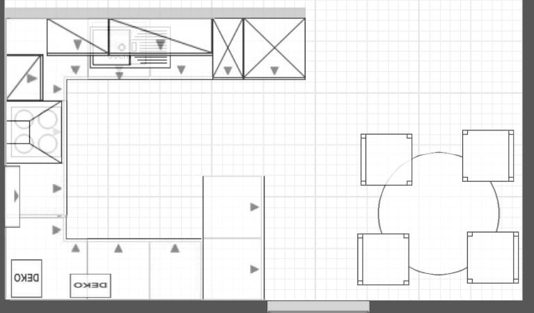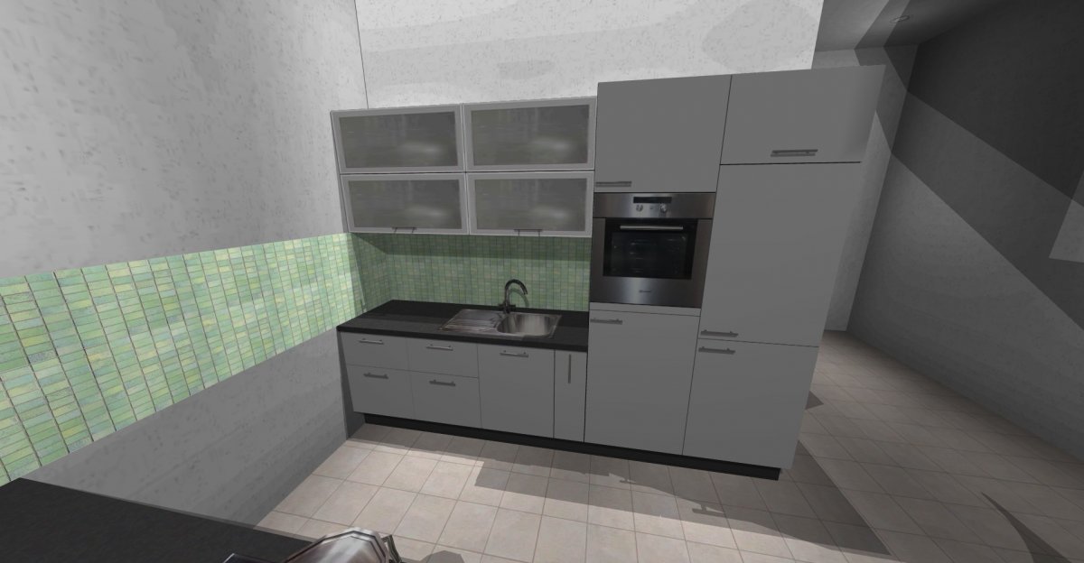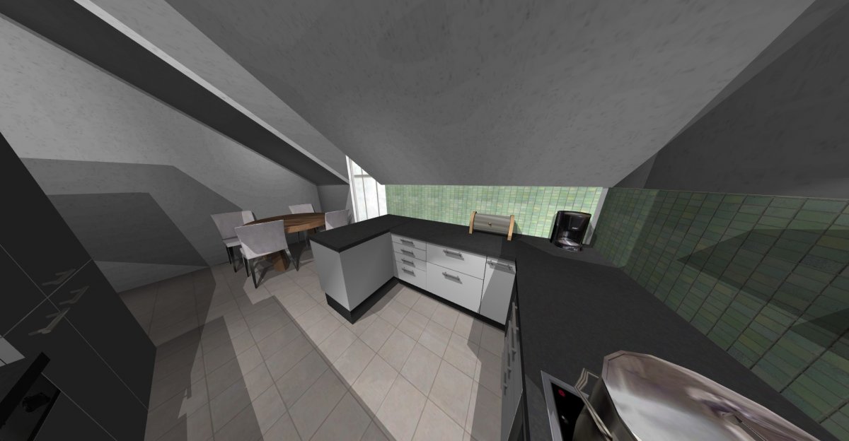 Ich habe mich bereits an einer Version versucht die ähnlich ist wie das was aktuell eingebaut ist nur die Küchenzeile um die zweite Ecke noch ins U erweitert und dann mit 2 60er Unterschränken das G vervollständigt um etwas mehr Platz zu schaffen. Aufgrund der Dachschräge bleibt halt wenig Platz für Höheres.
