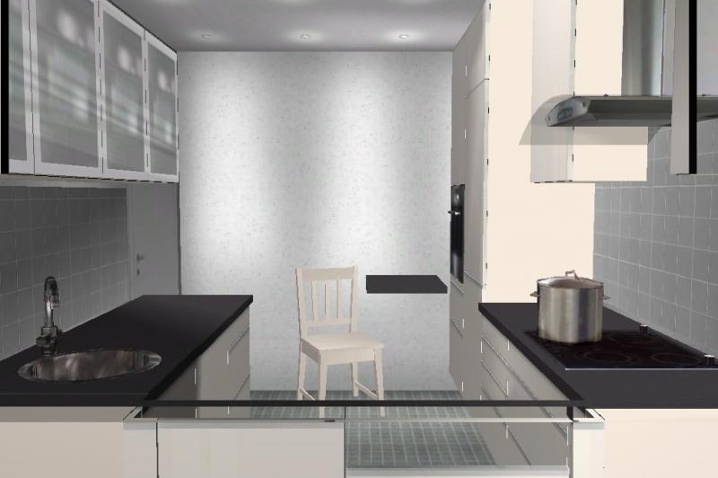Herausgekommen ist jetzt eine Sitzplatz Minimal-Lösung mit Klapptischle an der Wand vor dem Hochschrank mit dem Backofen . Alle anderen Möglichkeiten (eingeschoben nach den Hochschränken, rechts neben dem Fenster, gleich neben der Tür) wurden verworfen, weil sie ihm nicht gefallen und/oder zu viel Arbeitsplattenfläche schlucken.