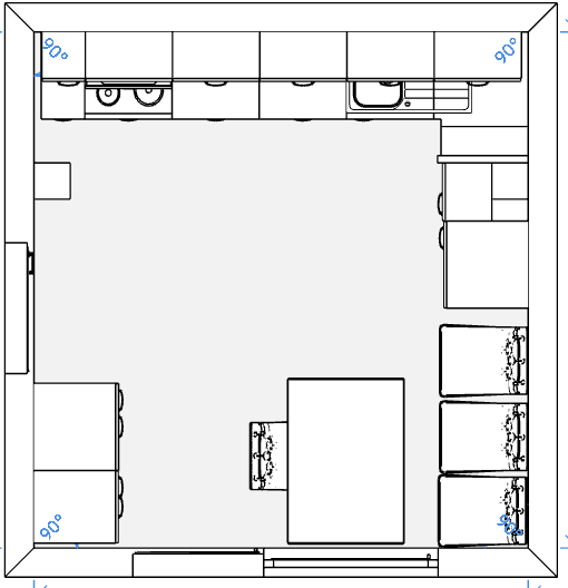 Versuch einmal bei deinem Plan einen Tisch und Sessel einzuzeichnen. Der Tisch sollte für 3 Personen mindestens 120 mal 80 sein.