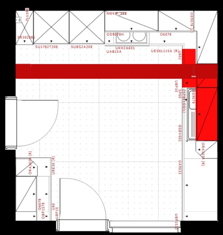 Der Bereich rund um die tragende Säule planrechts inkl. "Regal" in Insel muss verblendet werden, damit Wasser gezogen werden kann. Mein Planer taugt dazu nicht :-)