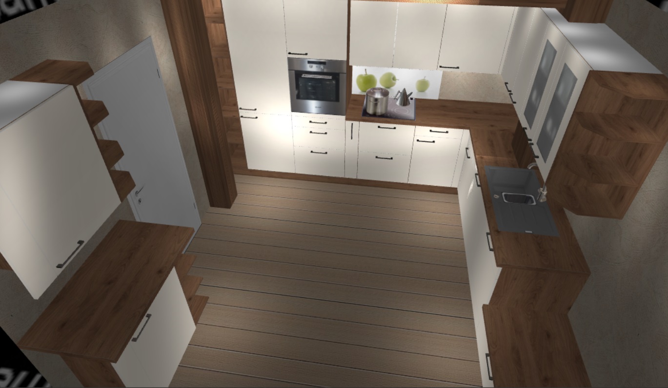 - Da an einer Seite der Eingang plus Mauervorsprung liegt und auf der anderen Seite das Fenster plus Terrassentür gibt es eigentlich nur 2 Wände, die für eine Küche in Frage kommen und damit eine L-Form.