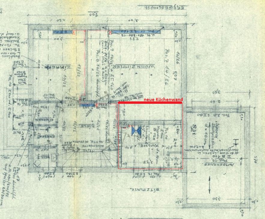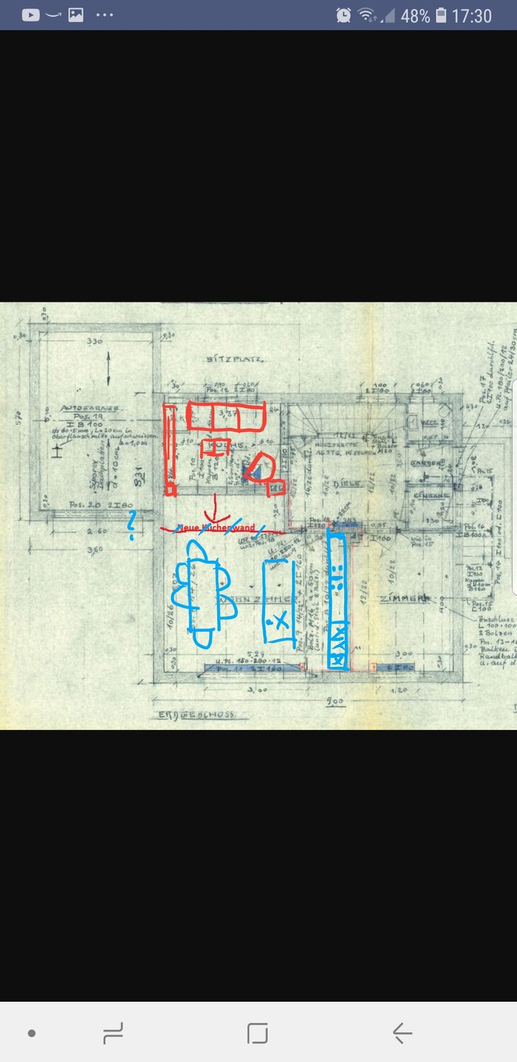 @Jette Der Umbau ist aktuell im Gange (Stahlträger wurde gesetzt, die neue Wand steht teilweise). Ich hänge hier noch einen alten Grundriss des EG an, weiß aber nicht, wie hilfreich das ist, denn dort ist die Küchenwand zum Wohnzimmer noch an der vorherigen Stelle und das kleine Viereck (SP.K.=Speisekammer gibt es auch nicht mehr).