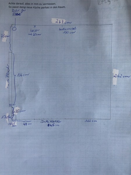 Den Wasseranschluss bzw. Ofenanschlus habe ich eingezeichnet, aber insoweit flexibel, da wir es ändern könnten. Unter der Küche befindet sich der Keller.