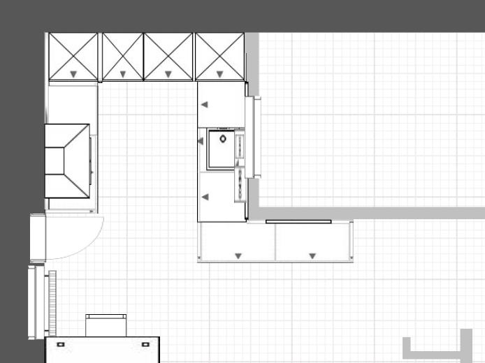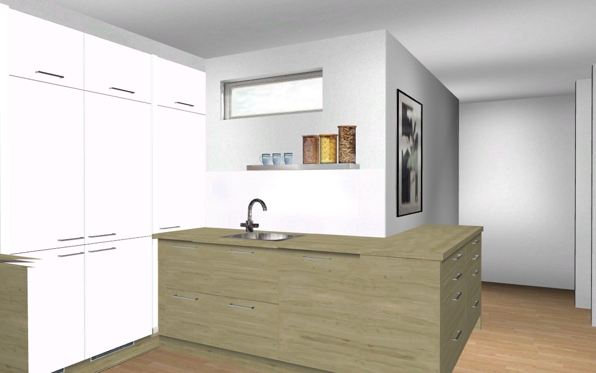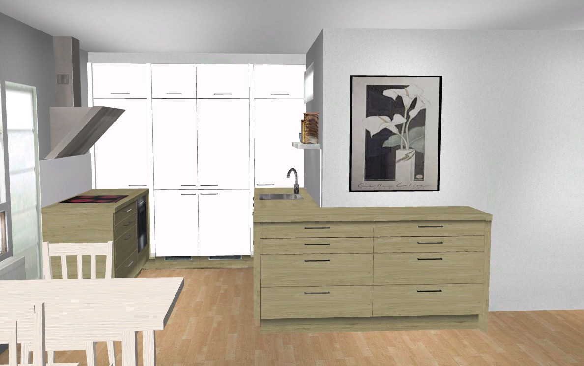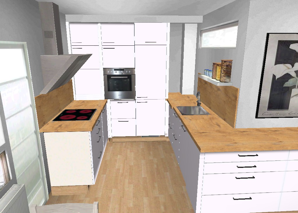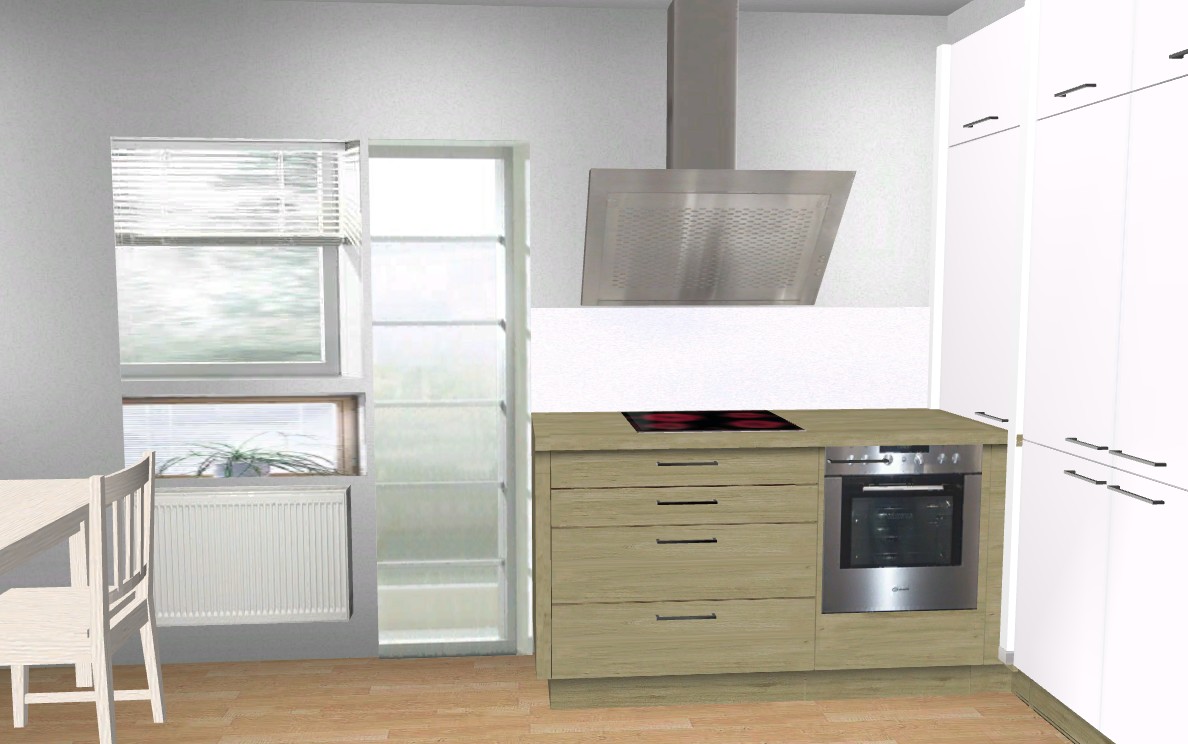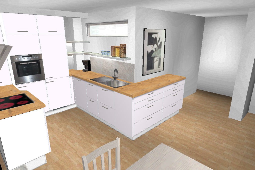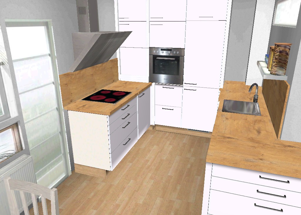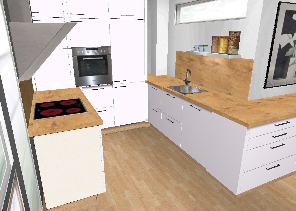 Das mit dem Ofen und der AP ist ärgerlich. Als Option habe ich die AP planoben links schmaler gemacht. Die Zubereitungszone ist zwar etwas schmaler geworden, was hoffentlich aber nicht ins Gewicht fällt, oder? Der Ullaschrank passt ganz gut in die Ecke planoben links. Der Ofen und die AP kommen sich nun nicht mehr in die Quere. Das Kochfeld ist vorne abgesetzt.