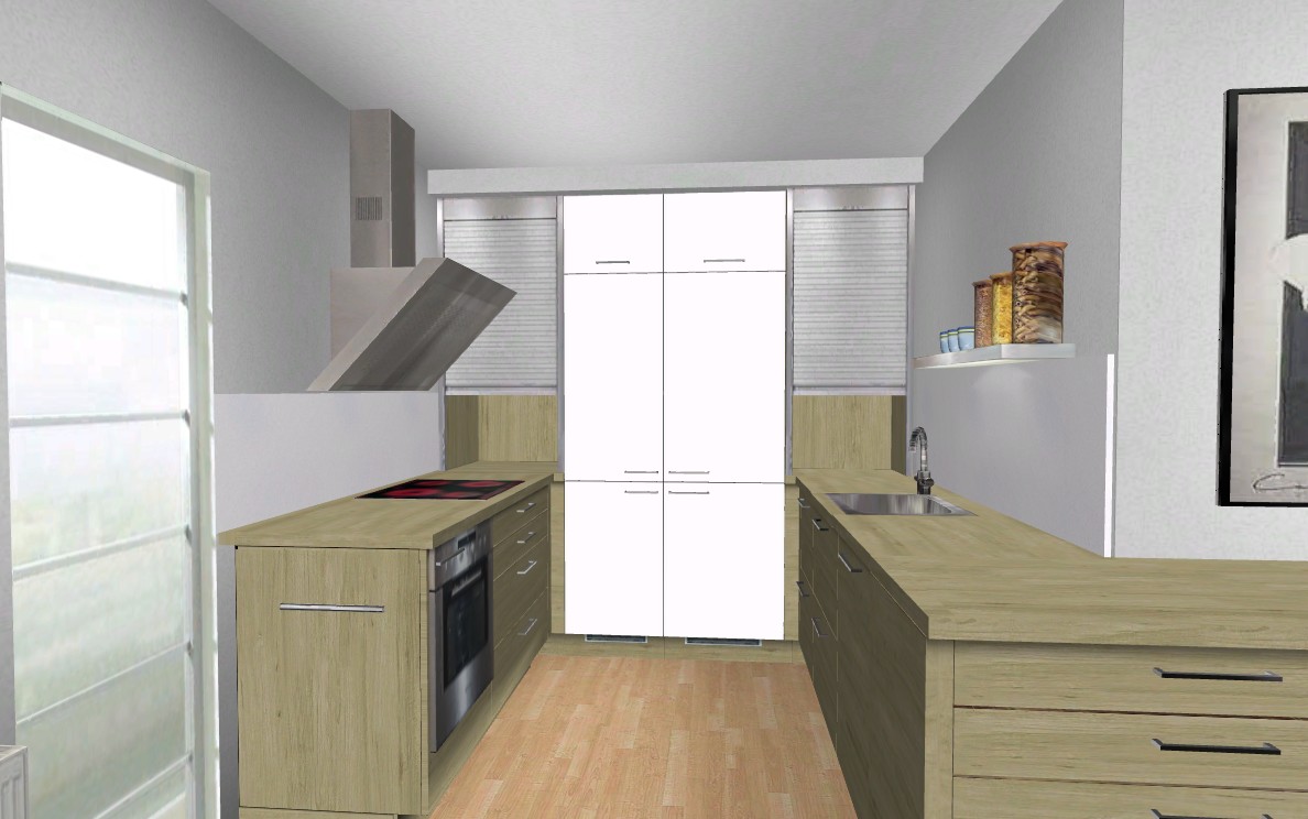 Wenn der Platz an der Rückwand zwischen den beiden Zeilen nicht für 2x60cm Seitenschränke reicht, dann eben 1x60cm Kühl-Gefrierkombi und 1x50cm für Vorräte/Getränke mit Innenauszügen bis in Augenhöhe.
