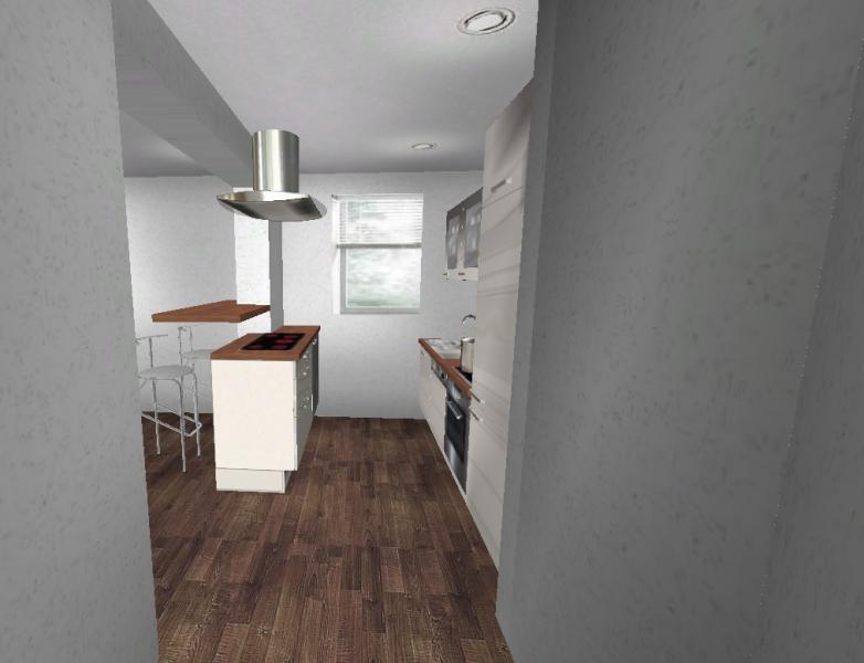 bin jetzt am Überlegen ob man nicht lieber zwei Zeilen stellen sollte, von der eine in den Durchbruch zum Wohnzimmer ragt und evtl. sogar die Herdplatten beherbergt und eine kleine Theke an der man essen könnte.
