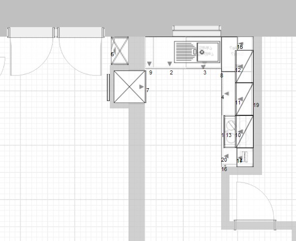 Ursprünlgich wollte ich die Küche L-förmig anordnen, mit der langen Seite rechts, 2,40m und der kürzeren "oben" im Plan 2,00m