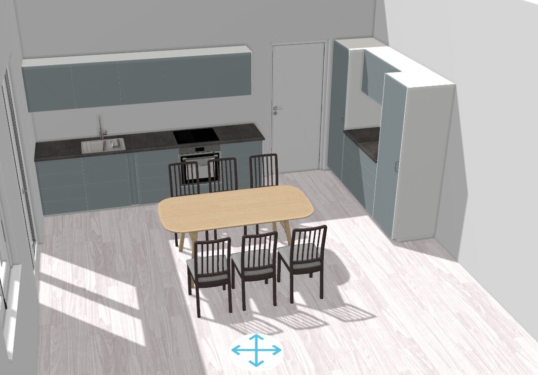 Da man die Tür noch verschieben kann, würde ich sie soweit nach rechts schieben, dass man an die rechte Wand Schränke stellen könnte. Planrechts dann links und rechts Hochschränke, innen eine Nische mit vorgezogenen Oberschränken, ggf. zum Abstellen von Geräten. Links der Tür eine Zeile mit Unter- und Obrschränken. Den Tisch davor, wie in Beitrag #18.