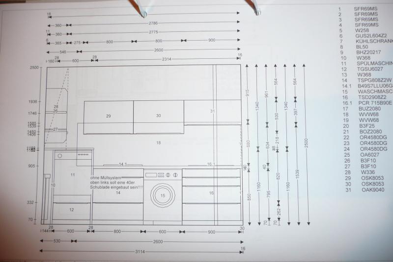 Noch eine technische Frage, wieviel muß man für die sog. Wangen abrechnen? Ich habe links wahrscheinlich L = 318, da habe ich die 3 cm, die ich durch Abschlag des uralten Doppelfliesenspiegels gewinne, schon eingerechnet. Abzüglich Heizung von ca 18, bleiben genau 300, das sind rein rechnerisch 2 x 60 für GSP und Wama und 2 x 90. Nach dieser Rechnung könnte der Spülen-US doch auch 90 breit sein. Da bekomme ich übrigens eine halbe Schublade als Sonderanfertigung unter 1/2 Abtropfe rein. Oder ist das eine zu knappe Milchmädchenrechnung? Der US muß ja so bestellt werden und der Haustechniker will sich nicht festlegen, wie weit die Heizung an die Wand rücken kann, außerdem muß immer noch Luft drumherumstreichen, sagt er.