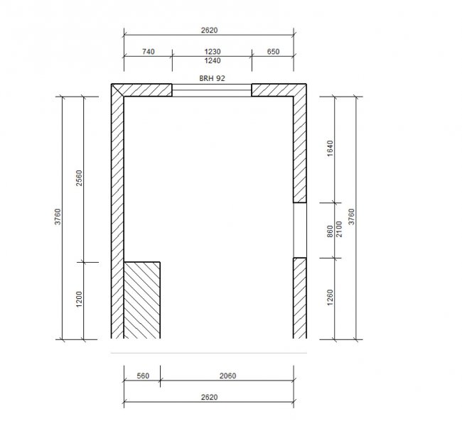 Ein Küchenstudio empfahl uns, den Türsturz rechts so zu versetzen, damit wir an der rechten Längsseite mit insgesamt 185 cm Länge mehr Platz für einen 90er Eckschrank schaffen. Wir finden diese Maßnahme jedoch etwas aufwändig und wären auch hier für Vorschläge dankbar.