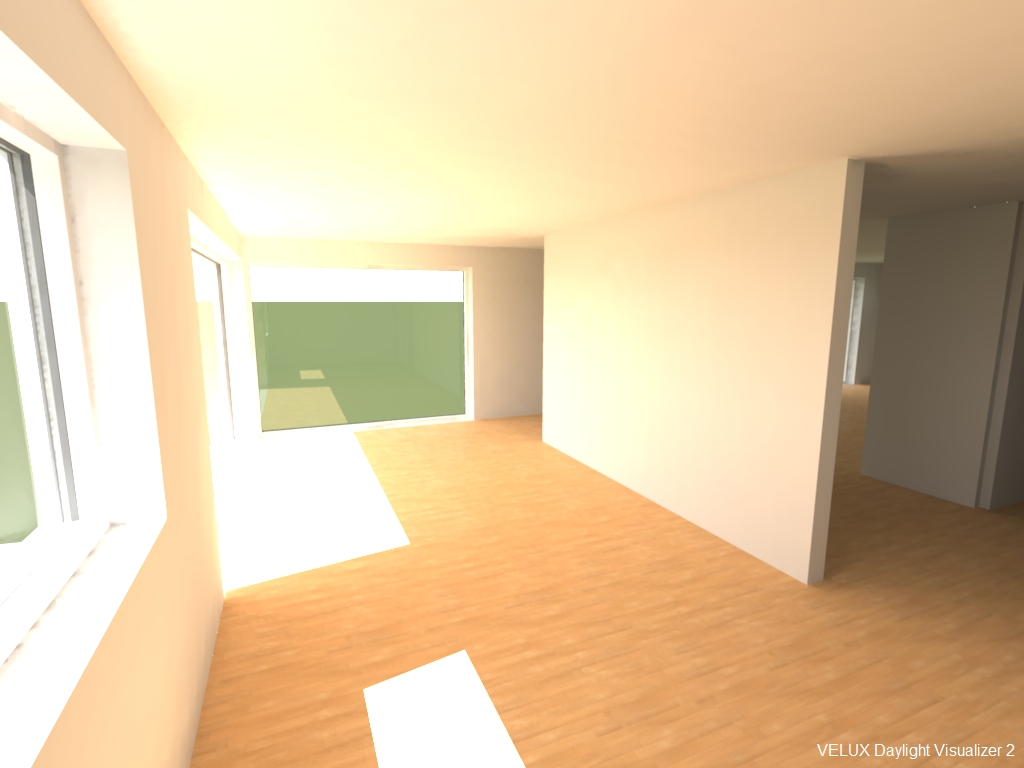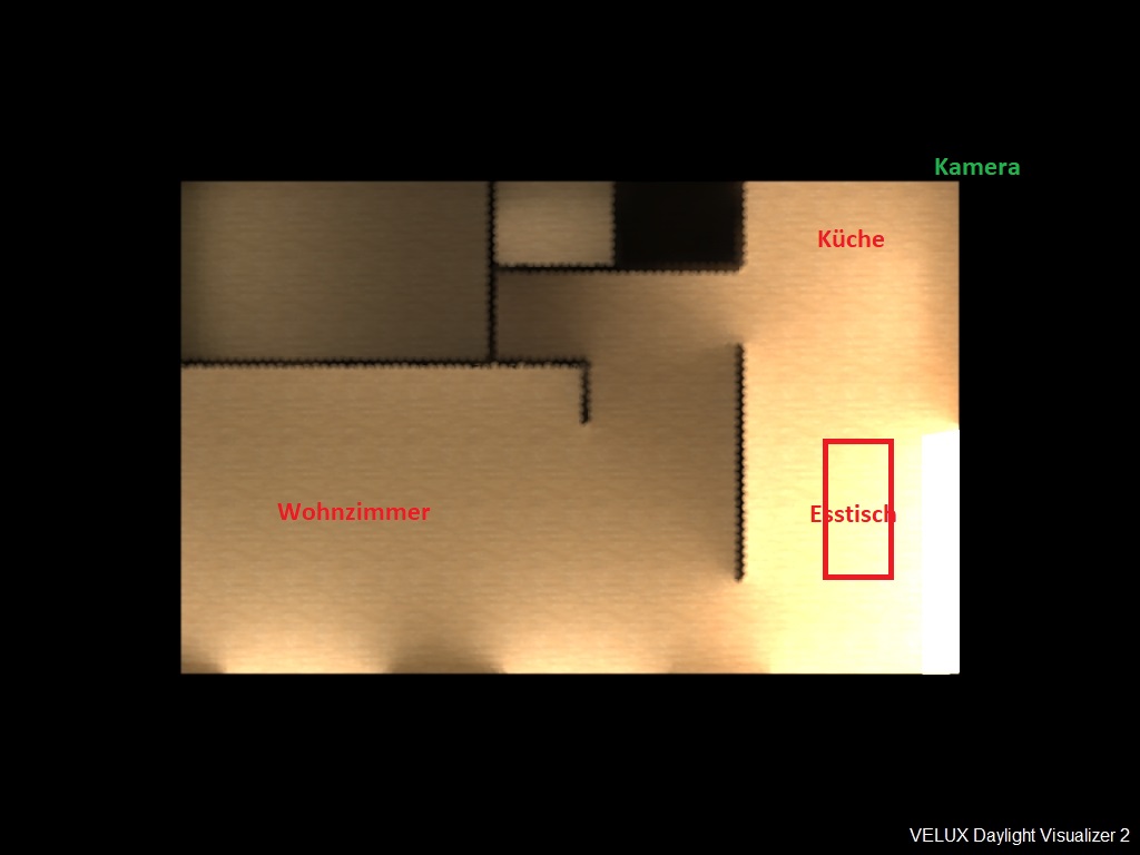 Hier mal eine Tageslichtsimulation für 10 Uhr Morgens. Eine angenehme Uhrzeit für ein gemeinsames Frühstück am Wochenende. Man beachte besonders die Lichtverhältnisse am Esstisch.