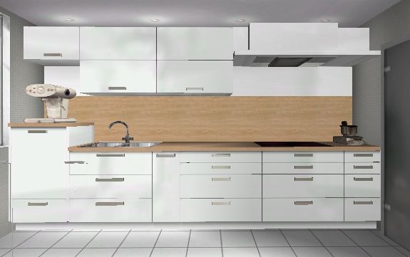 Gleichmäßige Einteilung Hänge/Unterschränke. Du wirst in deiner Küche selten so weit von der Zeile wegstehen können, wie ich es für die Ansicht simuliert habe und dein Blick wird eher nur den Oberschrankbereich umfassen. Ob man die DAH so machen muss ... war ein erster Versuch, einfach um die Kopffreiheit herzustellen und, weil ich meine Decken-DAH so schätze.