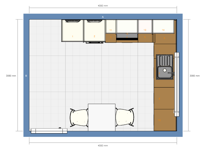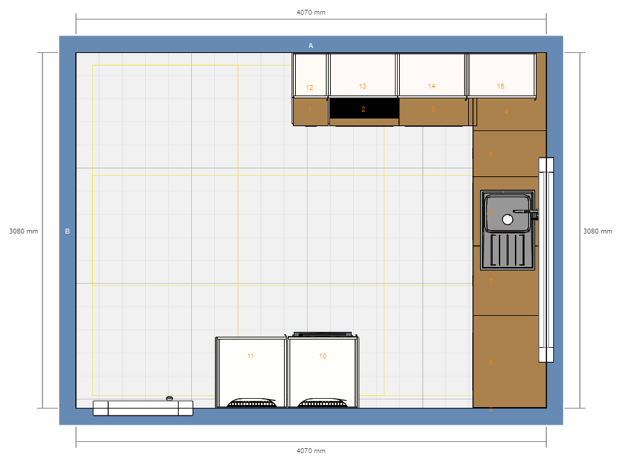 Hier stellen wir einfach die beiden Hochschränke separat und haben damit eine größere Arbeitsfläche auf der Zeile. Zudem stehen diese nicht mehr so wuchtig im Weg, wenn man aus dem Wohnbereich kommt. Wir könnten hier Mitnahmearbeitsplatten verwenden und von den Steckdosen her (habe ich auf den Plänen hier nicht eingezeichnet) passt das auch alles sehr gut.