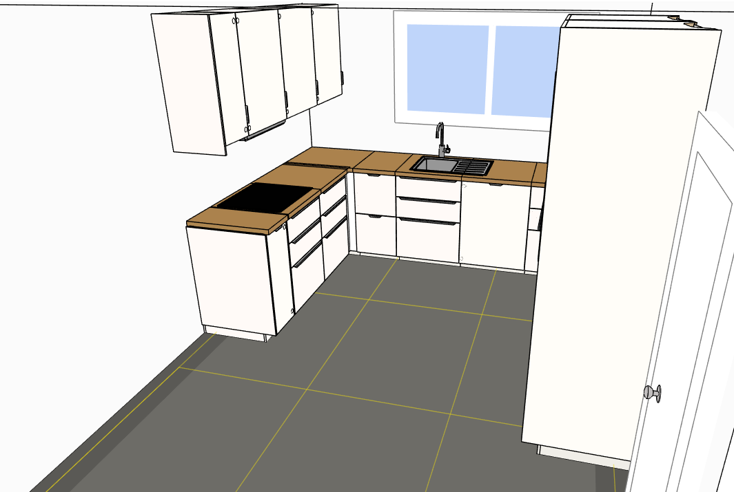 @ Vanessa: Über den Vorschlag die Arbeitsplatte nur unterm Fenster anzubringen habe ich auch nachgedacht - insbesondere, weil es mir vor der Selbstinstallation einer Über-Eck-Arbeitsplatte graut! Das wären dann aber nur etwas über 3 Meter APL auf denen Spüle, Kochfeld und Arbeitsbereich untergebracht werden müssten. Aus meiner Sicht nicht praktikabel.