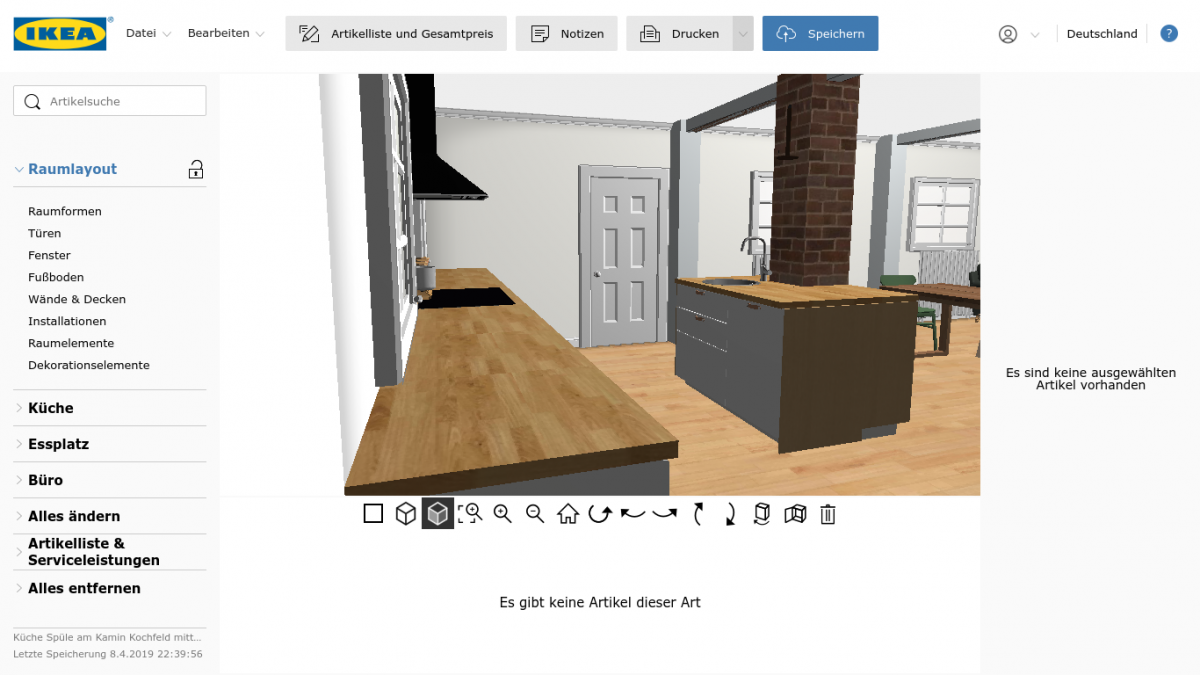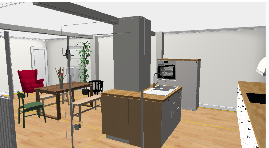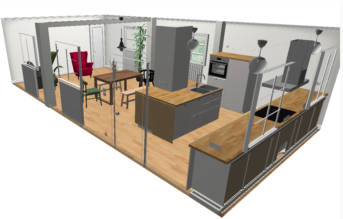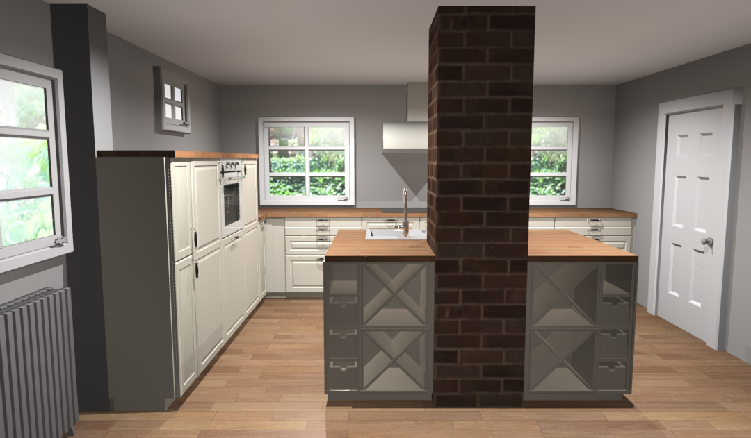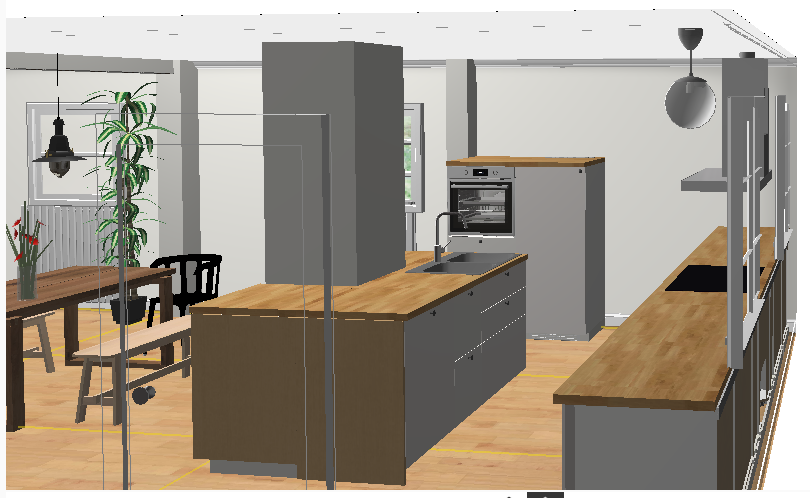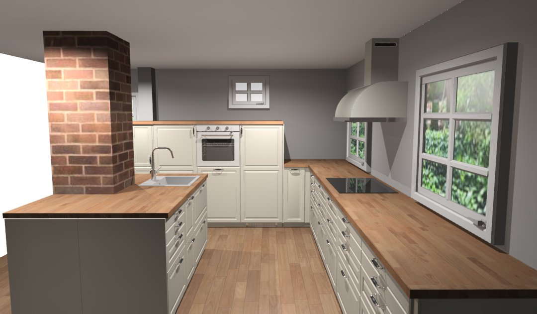 wir renovieren und gestalten gerade ein altes Haus (Bau erster Teil 1934-kein Denkmalschutz) und planen dafür eine neue Küche. Darin werden wir mit zwei Kindern wohnen und gerne kochen. Wichtig ist uns, unsere Räume nicht zu sehr zuzustellen sondern auch freie Räume zu erhalten (darum keine um die Ecke-Planung). Darüber hinaus sind uns Schubladen wichtig. In tiefen Schränken verliert sich bei uns einfach immer wieder alles mögliche und das Chaos beherrscht den Platz. Eine Kücheninsel wollen wir vor allem zum gemeinsamen Kochen und natürlich für Stauraum einbinden. In den Entwürfen hier ist nun die Spüle in der Mitte gelandet. Das liegt vor allem daran, dass aktuell dort die Wasseranschlüsse liegen. Diese können aber auch verlegt werden. Alternativ kann dann das Kochfeld mit Herd an den Kamin rücken. Von der Küchenzeile wird man aus den Fenstern in den Garten schauen. An den großen Raum ist eine Speisekammer angeschlossen, die ca 3m² fasst. Wir freuen uns auf eure Ideen zu diesem Projekt. Grüße!!!