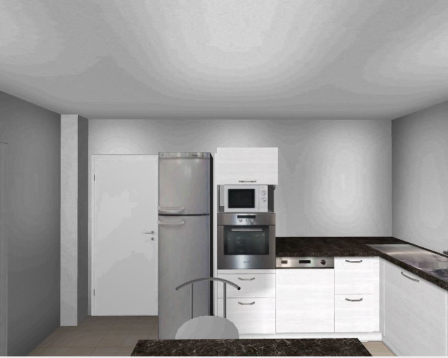 • nach rechts: doppelflüglige Schiebetür zum Wohnzimmer 150 cm breit (Türen laufen auf der Wand in der Küche - im Grundriss noch falsch auf der WZ-Seite eingezeichnet)