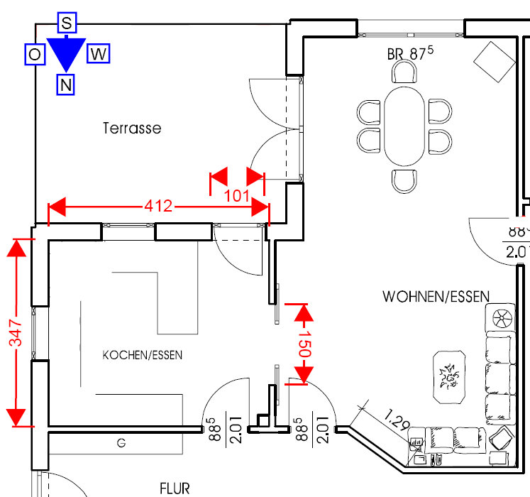 Nur als Hinweis, in deinem Grundriss ist dein Esstisch mit einer Größe von 75x144 cm eingezeichnet, dein Sofa planrechts mit einer Tiefe von 59 cm und planunten mit einer Tiefe von 73 cm. Das sind völlig unrealistische Größen ;-)