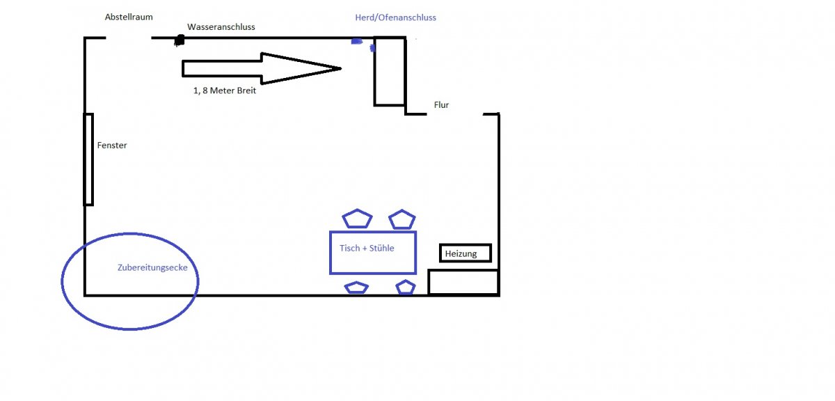 Anbei habe ich versucht einen Grundriss zu zeichnen. Ich hab dummerweise natürlich keine Maße für die Zubereitungsecke unten links...