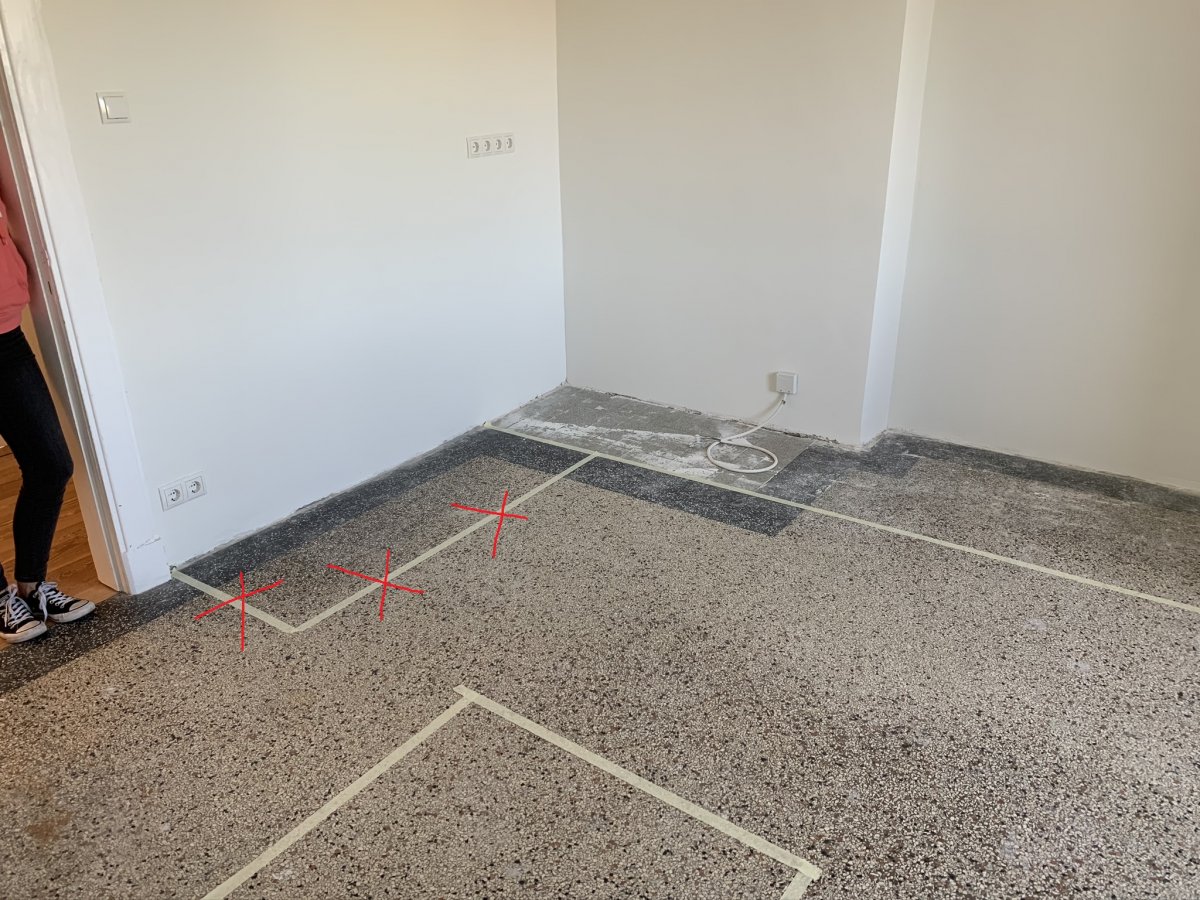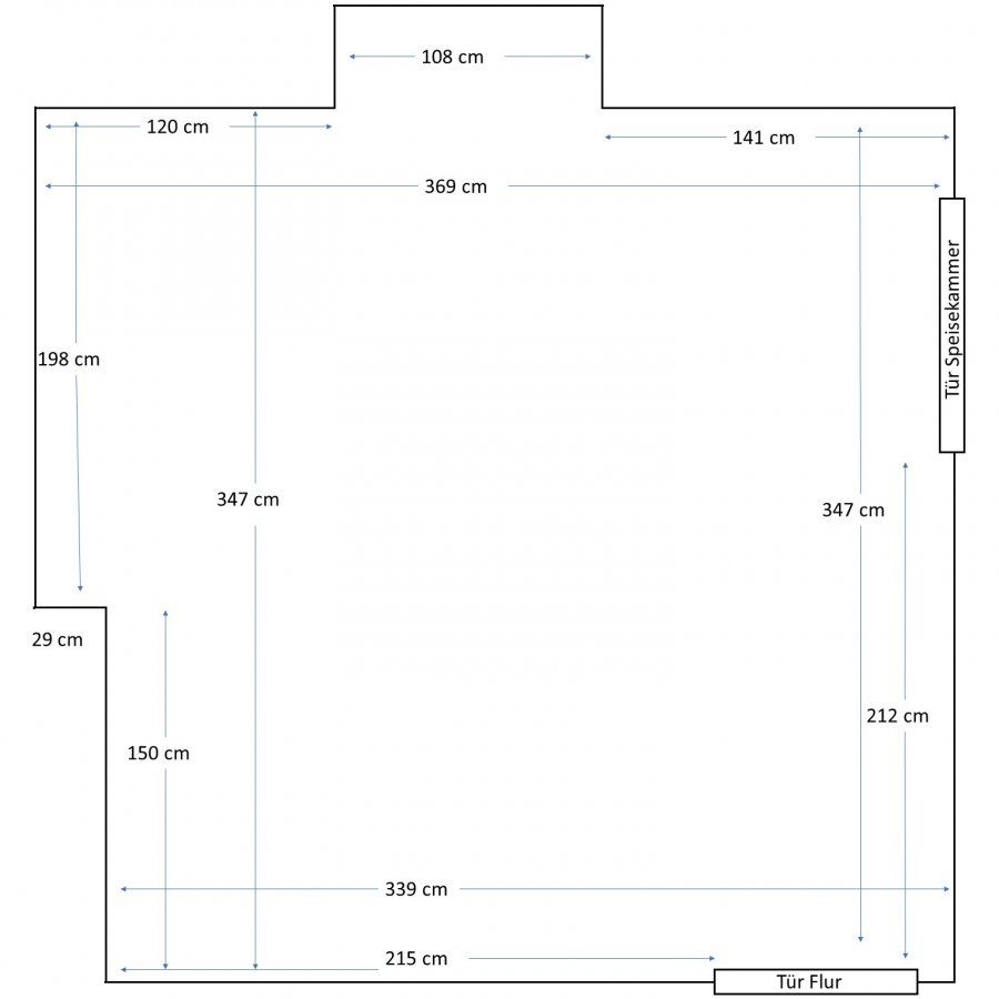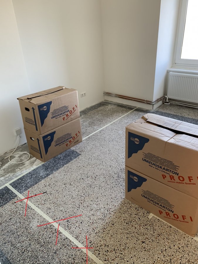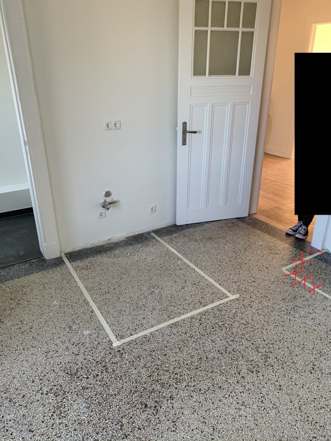 Ebenfalls habe ich ein paar Fotos vom Küchenraum hochgeladen. Wir testweise mit Kartons unsere Kücheninsel gestellt um zu schauen, wie viel Platz zwischen Insel und Küchenzeile bleibt. Die rot gestrichene Linie fällt weg. Unser aktueller Stand wäre also eine gerade Zeile (siehe Klebeband) sowie die Insel.