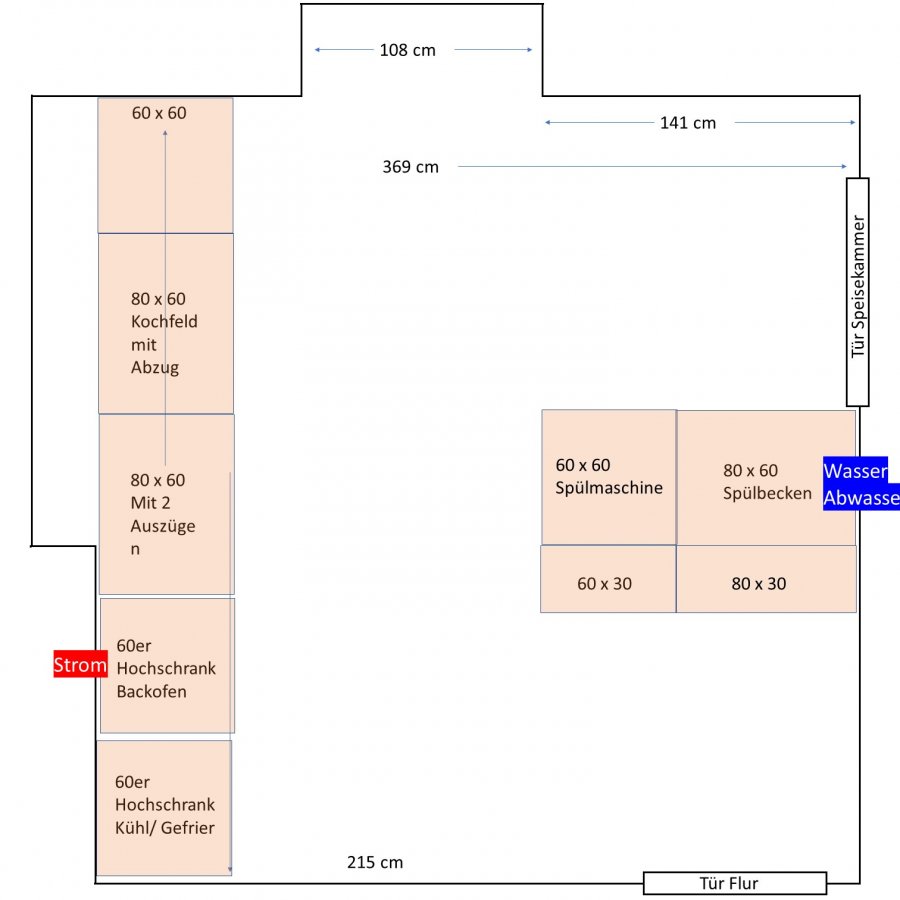 Einen ersten Ikea Entwurf habe ich ebenfalls hochgeladen. Eigentlich würden wir gerne auf Hochschränke verzichten und nur eine gerade Zeile machen. Allerdings können wir unter das Kochfeld mit Abzug den Backofen nicht stellen und eine versetzte Anordnung sieht irgendwie schwachsinnig aus. Auch für den Kühlschrank finde ich keinen besseren Platz.