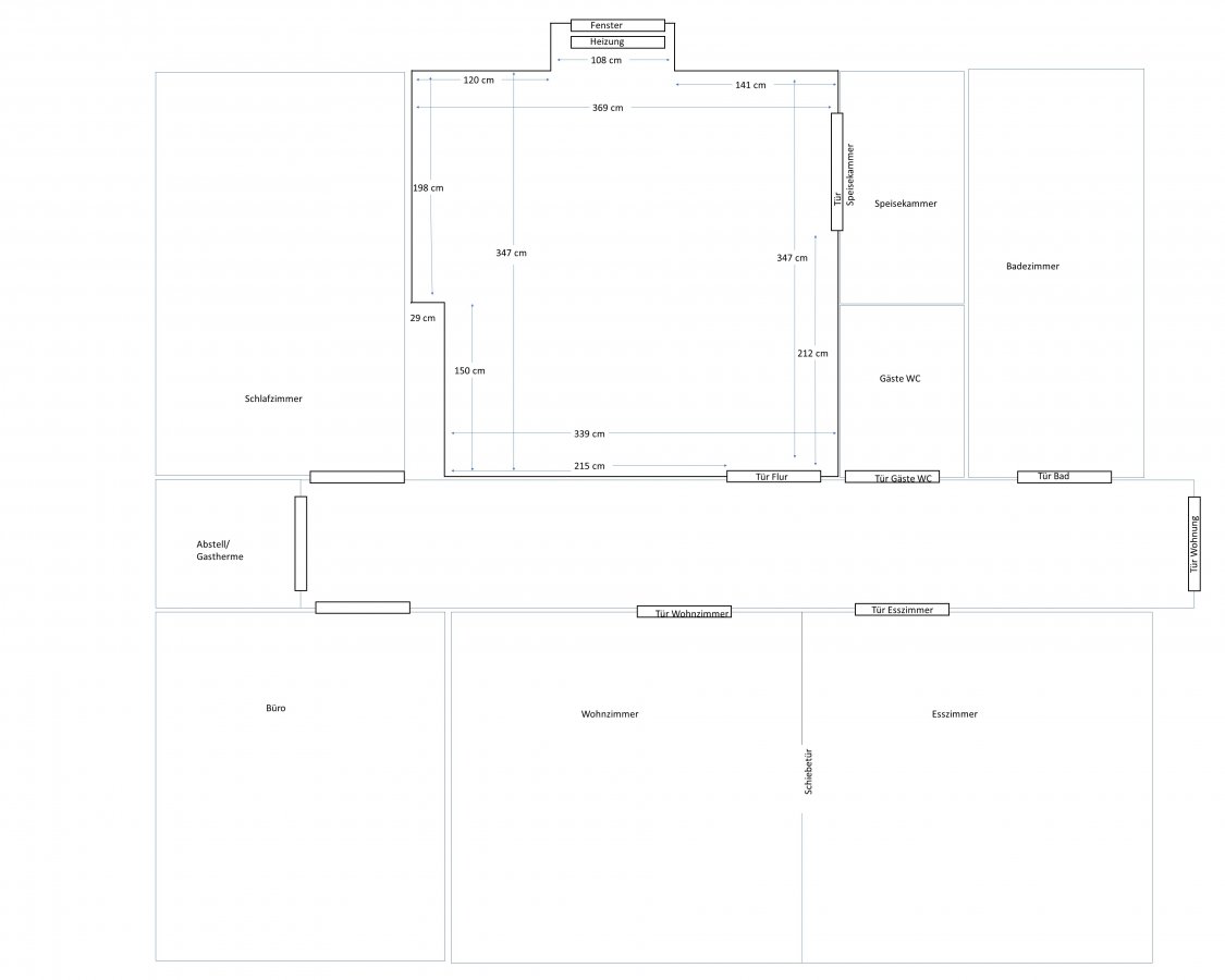 Vielen Dank für eure konstruktive und schnelle Kritik. Fenster und Heizung habe ich tatsächlich gestern Abend vergessen. Ich habe den Grundriss aktualisiert mit der ganzen Wohnung (außer der Küche ist allerdings nichts maßstabsgetreu).