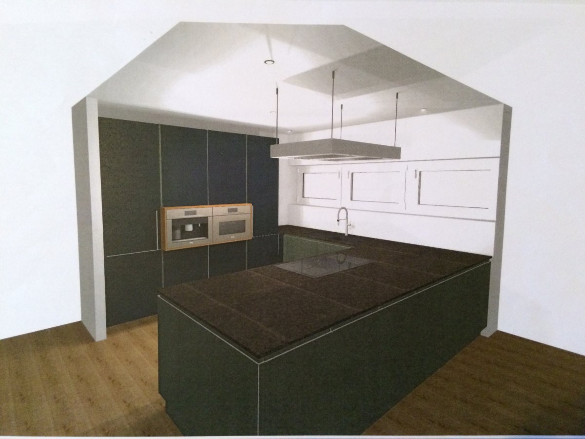 2. Eine Küche von Leicht mit Tocco Carbon Grey und Griffmulde. Die Steinplatte ist Nero Assoluto satiniert. Von Leicht haben wir höhere Schränke genommen. Mit Sockelleiste ca. 2,40m.