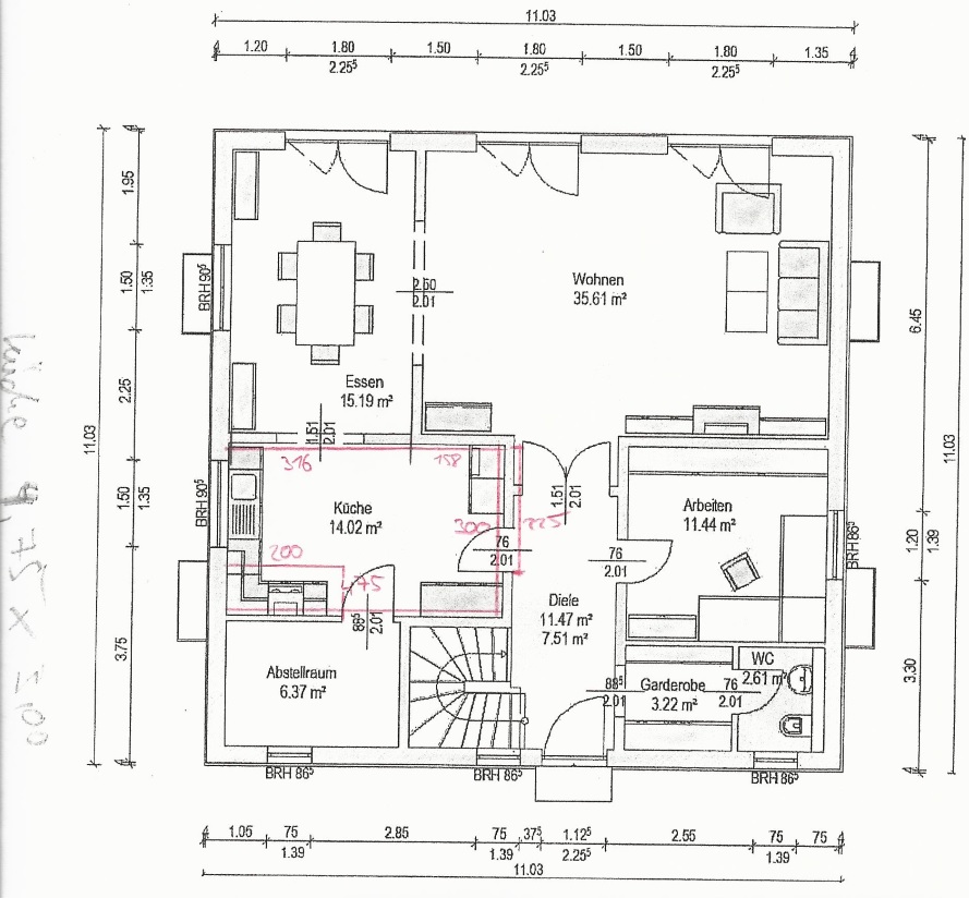 • Wir brauchen immer voll vermaßt Grundrisse, d.h. jeden kleinen Abstand. Also z.B. Wand bis Fenster, Fenster, Fenster bis Wand bzw. ist denn da eine Wand? In dem Grundriss sieht es aus, als sei da nur ein breiter Durchgang. Du schreibst aber von offen. Sind die 316cm also komplett offen? Der Durchgang im Küchenentwurf wäre mir zu schmal.