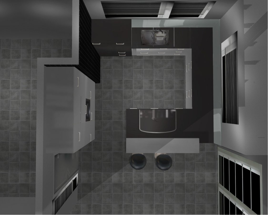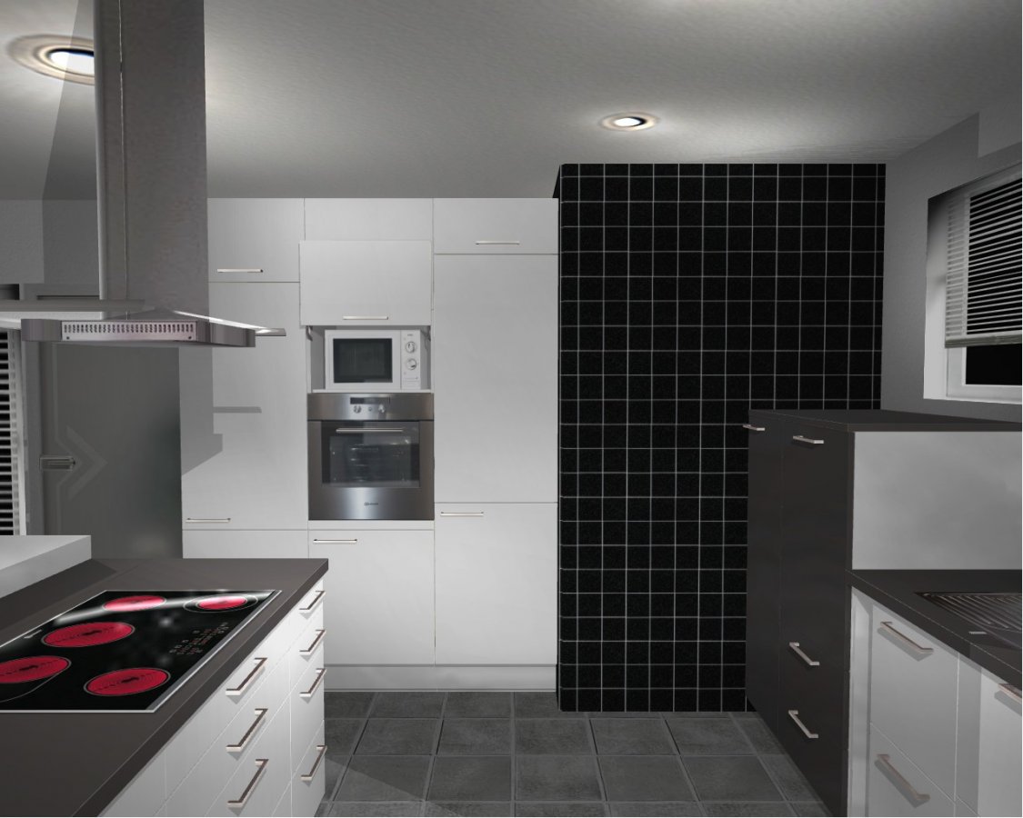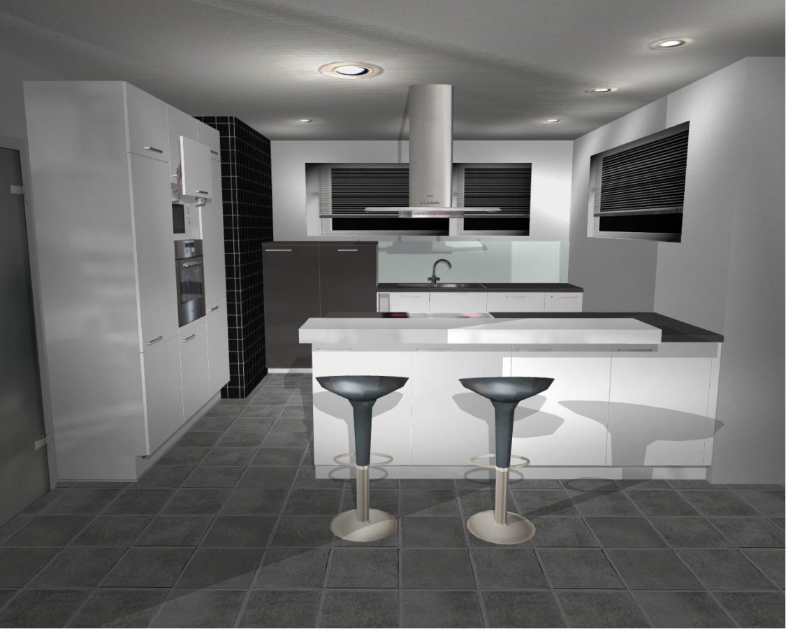 Wir haben versucht den gesamten Wohn-, Ess- Küchenbereich inkl. Erker mittels V17.b zu modellieren. Den Erker konnten wir allerdings nur durch zusätzliche Wandelemente darstellen. Auch die lässt der Alno-Planer nur Raumlängen bis 900cm zu, planrechts sind im Wohn- und Essbereich also noch 25cm mehr Platz. Die schwarzen Fliesen an der Ecke im Küchenbereich sind stellvertretend für Naturstein Verblender aus Schiefer zu verstehen. Die Griffpositionen, Rasterungen und Linienführung insbesondere des HS sind nur als grobe Annäherung zu verstehen. Maßgebend ist die nachfolgende schriftliche Aufstellung.
