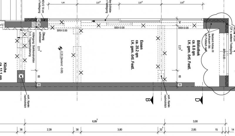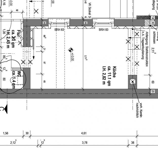 Bevor die SBS Diskussion ausartet, der Kühlschrank passt nicht in die Ecke der Türe, das haben wir schon gemessen. ;-) Alleine schon, da es Probleme mit dem Öffnen der SBS-Türe gibt. So schlecht finde ich den zwischen den Fenstern auch gar nicht. Die Schiebetür wird übrigens auf der Flurseite realisiert, nicht auf der Küchenseite. Ist also nicht im Weg. Der Schornstein verringert sich ggf. noch auf ein Maß von 32x32 + Putz, da nicht sicher ist, ob sich der Bestand ertüchtigen lässt, ich hatte allerdings erst einmal mit dem IST-Zustand geplant.