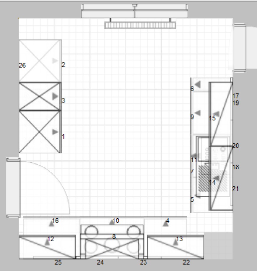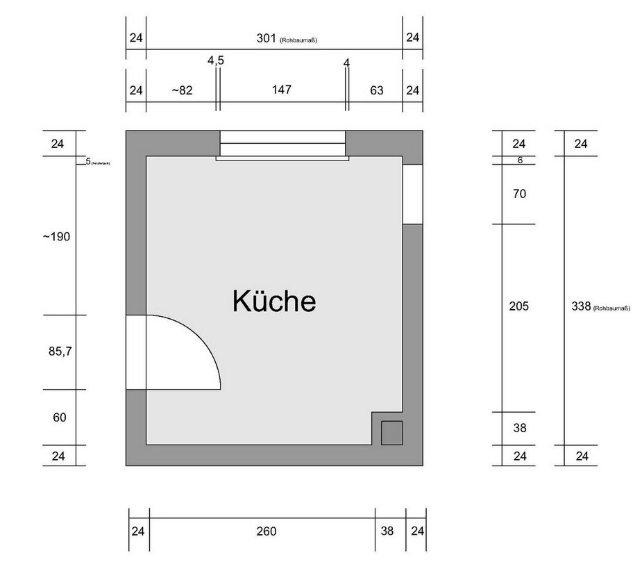 Ich würde mit der Änderung des Türanschlags anfangen: In Deinem Entwurf kann man einen Teil der Kochzeile nicht wirklich verwenden weil entweder steht die offene Tür davor, oder man riskiert, diese in den Nacken zu bekommen, wenn man gerade dort steht.