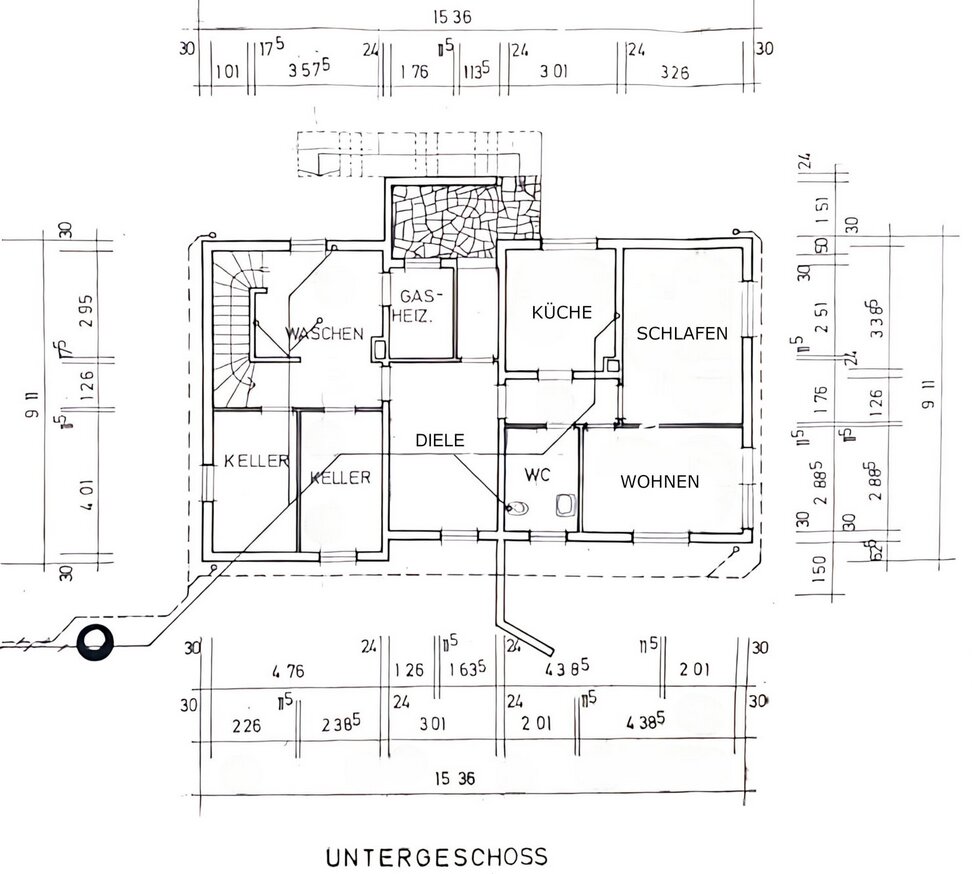 Der Grundriss basiert auf einem Untergeschoss (Keller) in Hanglage, das heißt, dass die linke Hälfte des Plans noch unter der Erde ist, während die rechte Hälfte regulär freistehend ist. Das Erdgeschoss ist oberhalb des Untergeschosses ein normales Vollgeschoss. Der Dachboden ist nicht ausgebaut. --> Die Schlafzimmer sind "unten", die Wohnräume "oben".