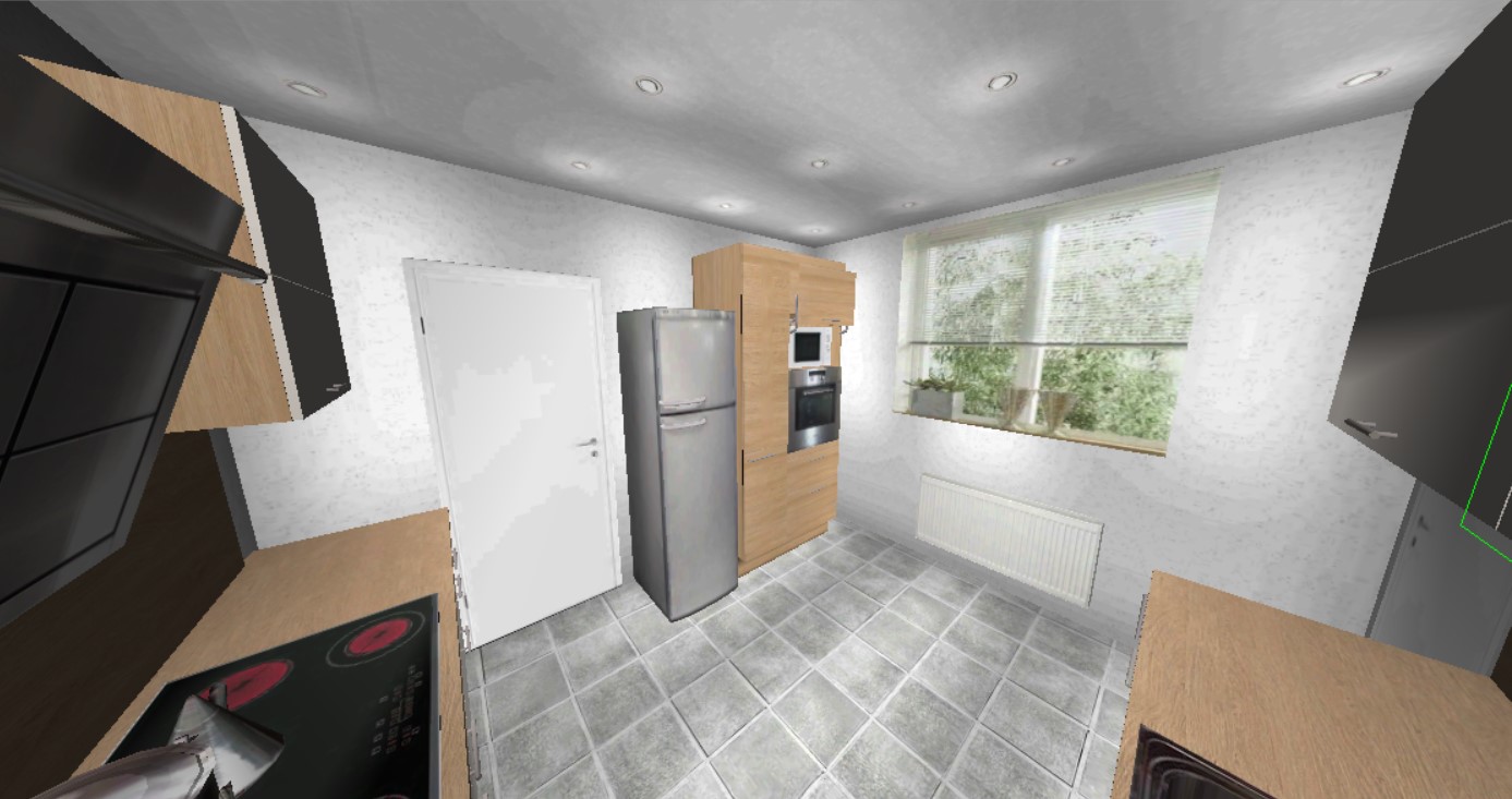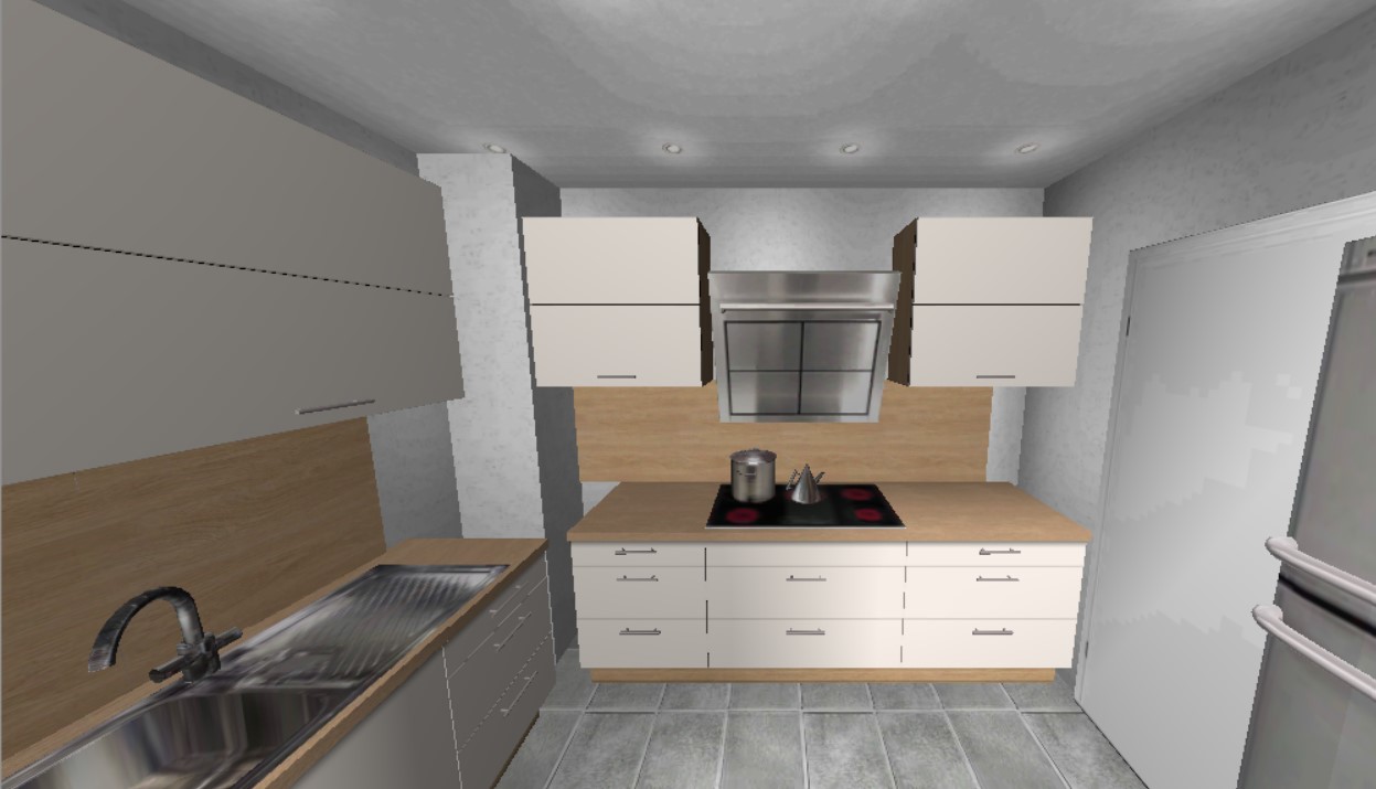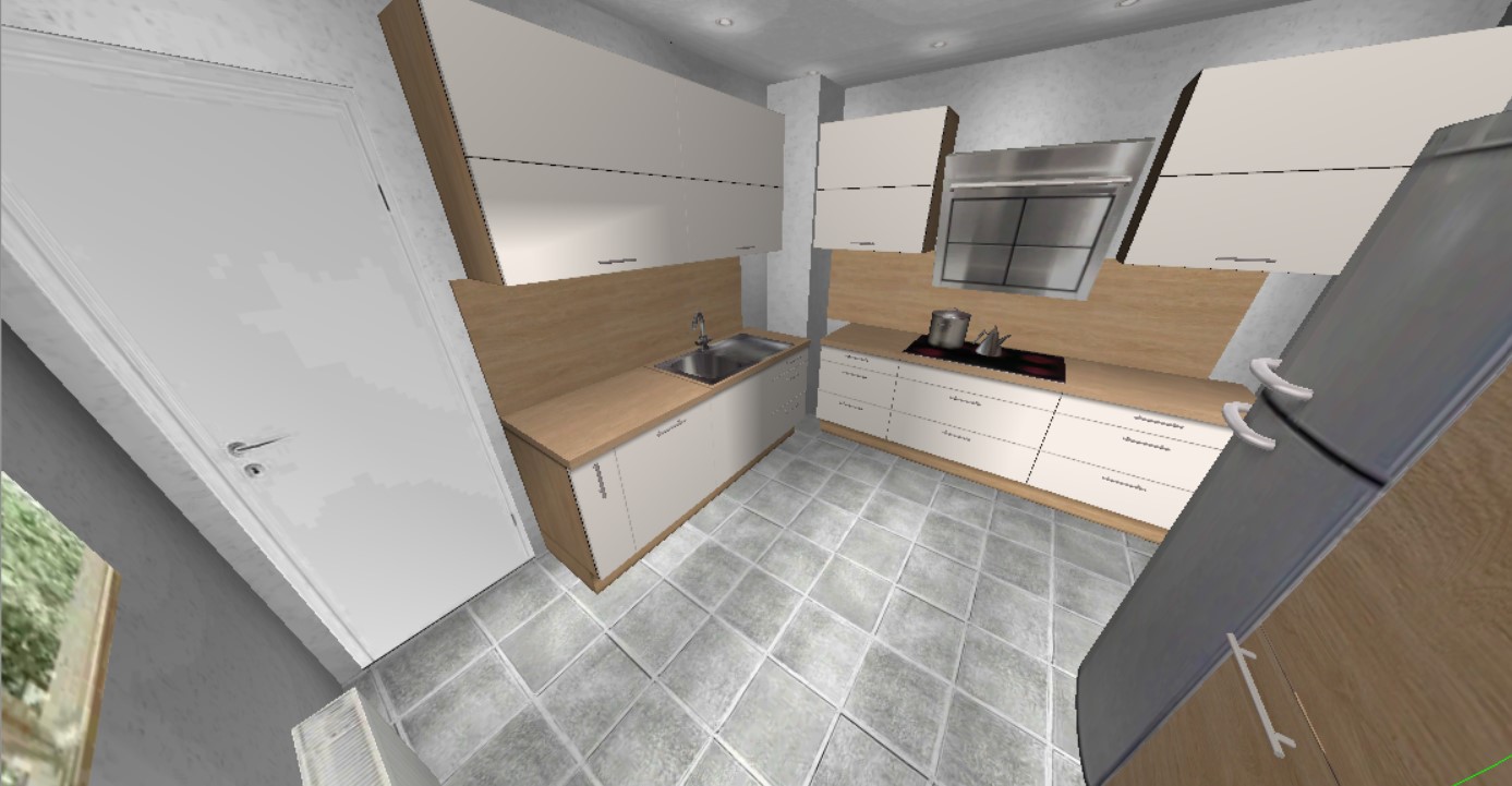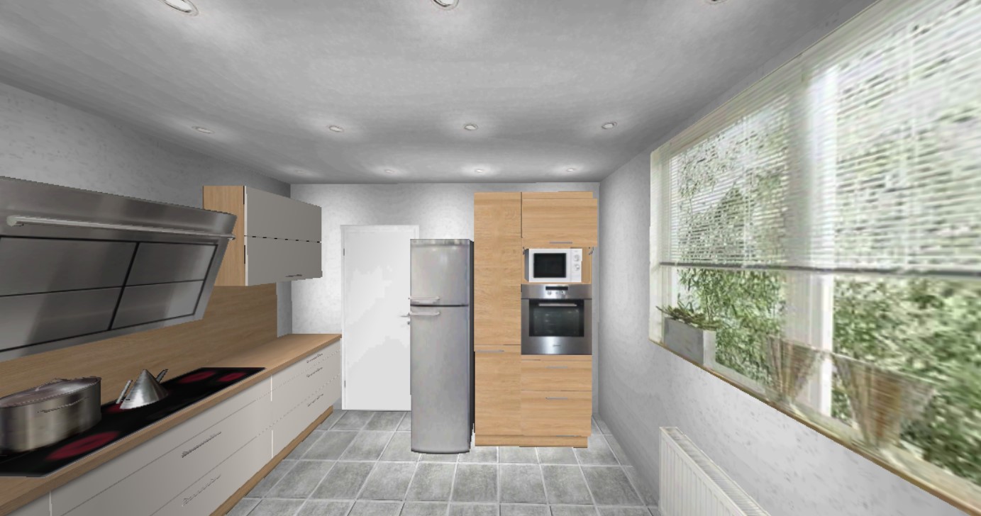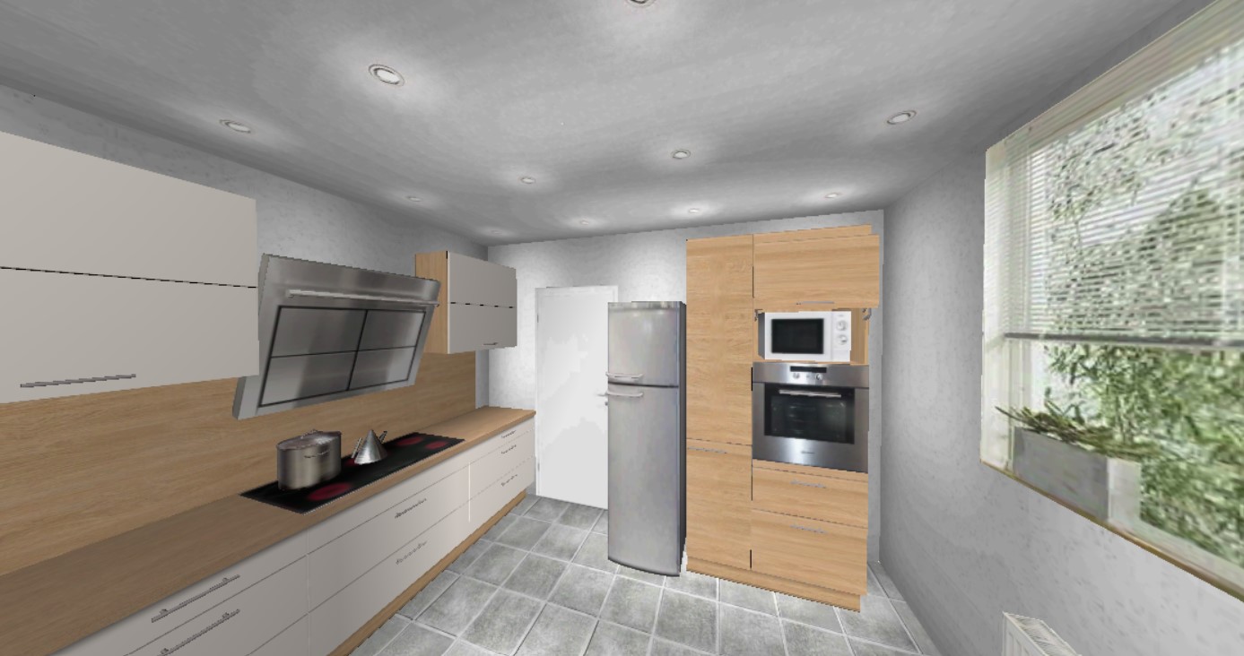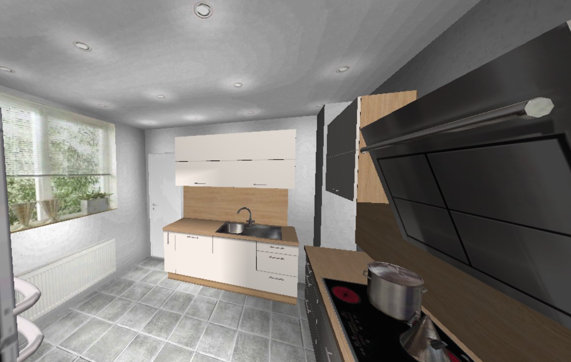Vor das Fenster kann eigentlich nichts gebaut werden da direkt darunter die Heizung ist. Die Fensterbank steht leider 5 cm in den Raum, daher hat die Küchenplanerin der Nobilia Küche ein kleines offenes Regal neben den Backofen , zur Wand hin, geplant. Dieses konnte ich im Alno Planer hinzufügen. Auch war es mir nicht möglich die Ecke des Kamins mit einer Arbeitsplatte auszufüllen.