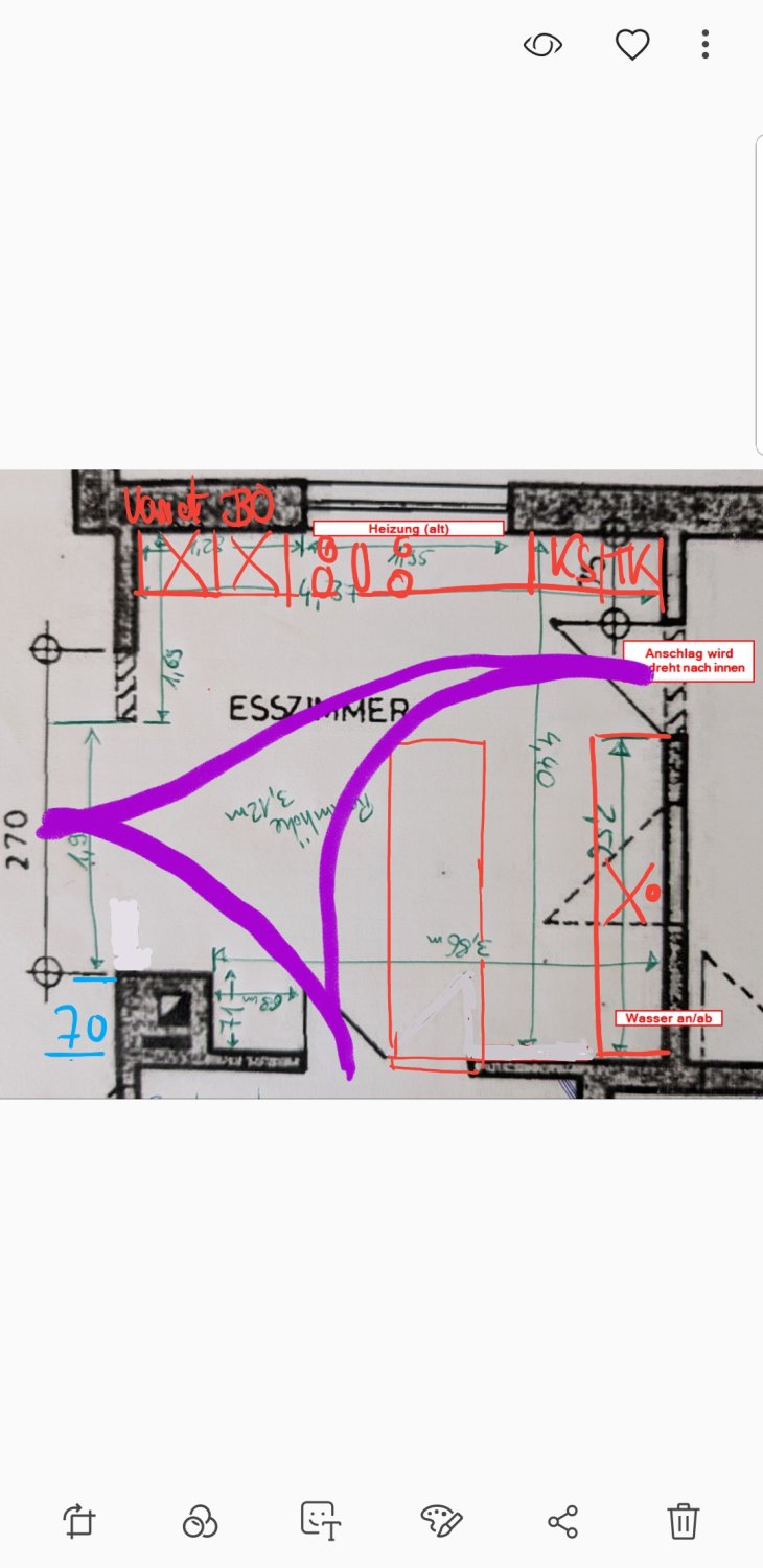 Stimmt Sabine .. da war auch Mal eine Tür und der Sturz ist wahrscheinlich noch da, könnte man also einfach herstellen. Allerdings kommen von unten rechts aus der aktuellen Küche die Wasser zu und Ableitung womit dann nur noch sehr wenig Platz für spülen und Geschirrspüler wäre ... Aber ja ... Auch eine Option ...