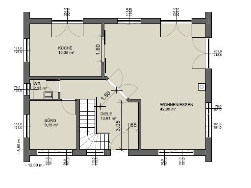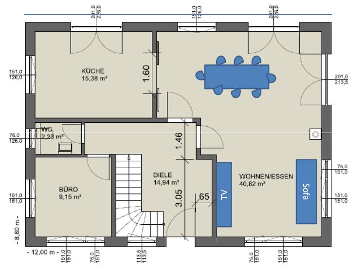 Bei der schrägen Tür ... mir gefällt so etwas halt einfach nicht. Man öffnet entweder nur einen Flügel der Tür und geht dann in die Küche, stehen beide Flügel offen, umläuft man auch die linke Tür wg. Küchenzugang. Das ist alles unrund. Die Eingangstür gleich neben der Treppe. Simuliere mal, wenn du von innen nach draußen gehen willst. Gibt es eigentlich einen Keller? Vermutlich ja - oder? Kellerzugang dann im WC-Flur?