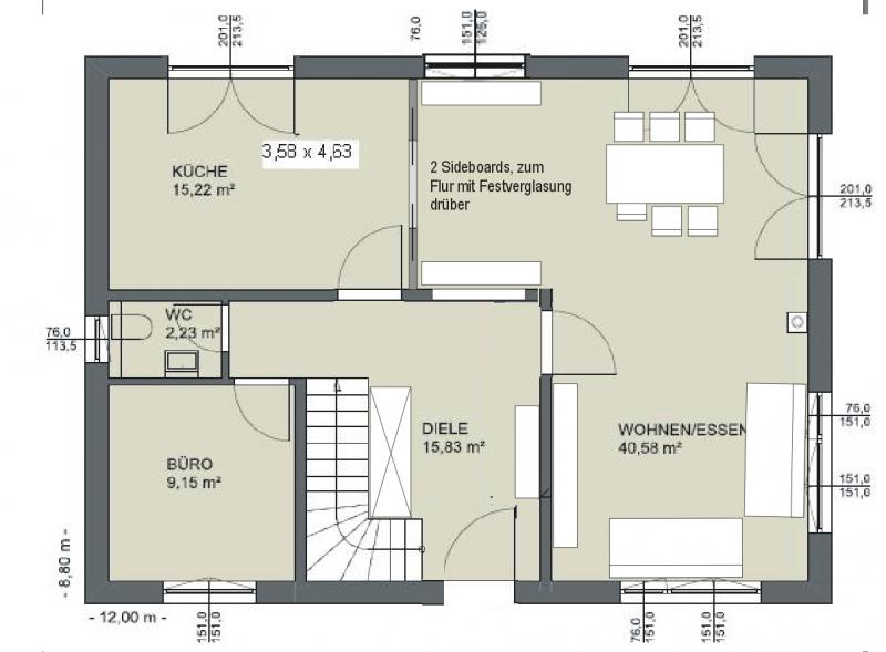 Im Essbereich hätten dann 2 Sideboards Platz, über dem einen könnte ein Lichtband oder so zum Flur sein.