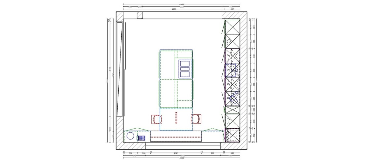 Bei so viel Platz würde ich das Kochfeld etwas mittiger positionieren, um rechts mehr Ablagefläche zu haben.